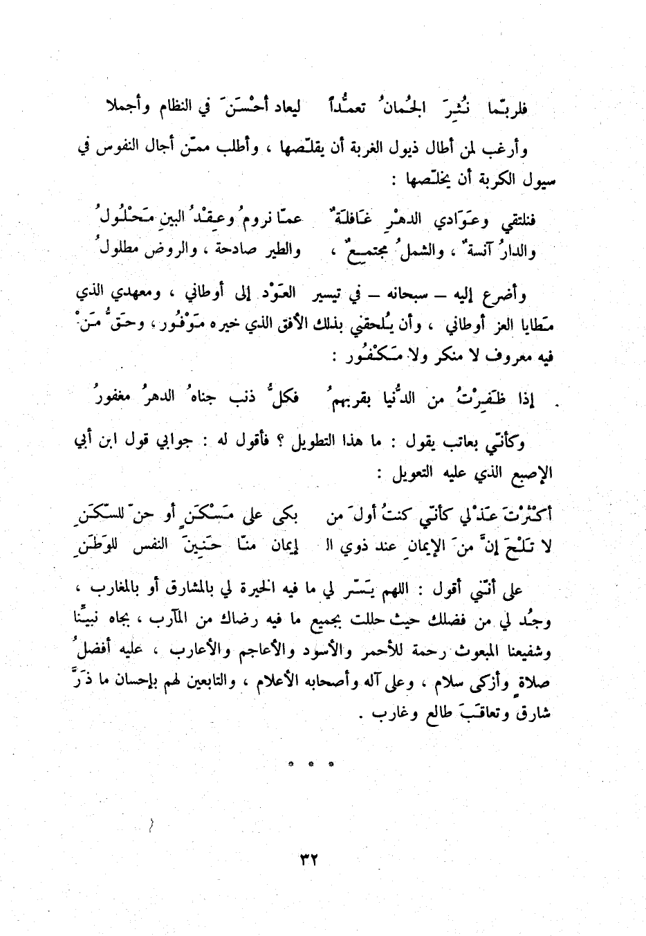 وأضرع إليه - سبحانه - في تيسير العود إلى أوطاني، ومعهدي الذي مطايا العز أوطاني، وأن يلحقني بذلك الأفق الذي خيره موفور، وحق من فيه معروف لا منكر ولا مكفور: