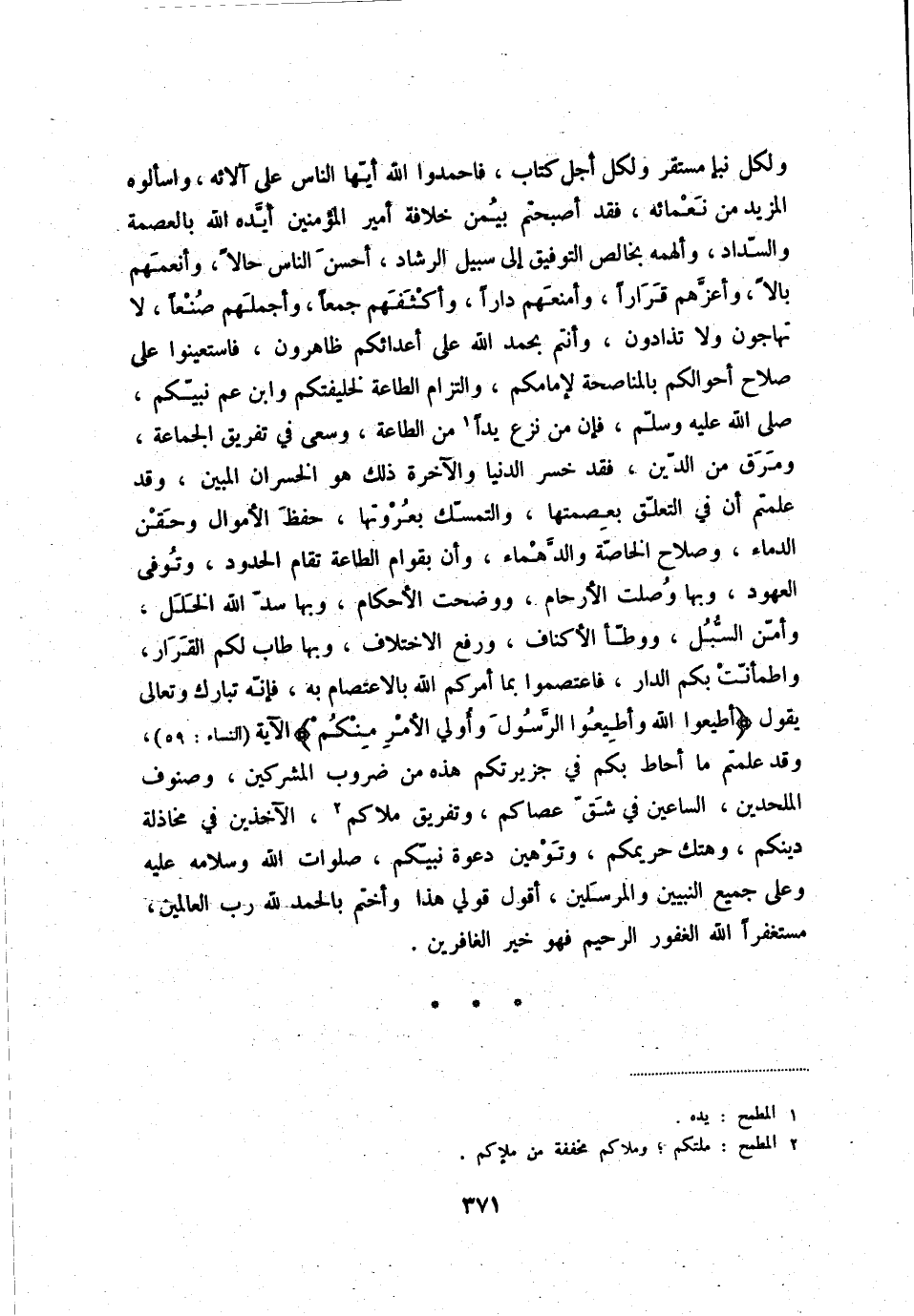 ولكل نبإ مستقر ولكل أجل كتاب، فاحمدوا الله أيّها الناس على آلائه، واسألوه المزيد من نعمائه، فقد أصبحتم بيمن خلافة أمير المؤمنين أيّده الله بالعصمة والسّداد، وألهمه بخالص التوفيق إلى سبيل الرشاد، أحسن الناس حالاً، وأنعمهم بالاً، وأعزهم قراراً، وأمنعهم داراً، وأكثفهم جمعاً، وأجملهم صنعاً، لا تهاجون ولا تذادون، وأنتم بحمد الله على أعدائكم ظاهرون، فاستعينوا على صلاح أحوالكم بالمناصحة لإمامكم، والتزام الطاعة لخليفتكم وابن عم نبيّكن، صلى الله عليه وسلّم، فإن من نزع يداً (1) من الطاعة، وسعى في تفريق الجماعة، ومرق من الدّين، فقد خسر الدنيا والآخرة ذلك هو الخسران المبين، وقد علمتم أن في التعلّق بعصمتها، والتمسّك بعروتها، حفظ الأموال وحقن الدماء، وصلاح الخاصّة الدّهماء، وأن بقوام الطاعة تقوم الحدود، وتوفى العهود، وبها وصلت الأرحام، ووضحت الأحكام، وبها سدّ الله الخلل، وأمّن السّبل، ووطّأ الأكناف، ورفع الاختلاف، وبها طاب لكم القرار، واطمأنّت بكم الدار، فاعتصموا بما أمركم الله بالاعتصام به، فإنّه تبارك وتعالى يقول " أطيعوا الله وأطيعوا الرّسول وأولي الأمر منكم "، وقد علمتم ما أحاط بكم في جزيرتكم هذه من ضروب المشركين، وصنوف الملحدين، الساعين في شقّ عصاكم، وتفريق ملاكم (2) ، الآخذين في مخاذلة دينكم، وهتك حريمكم، وتوهين دعوة نبيّكم، صلوات الله وسلامه عليه وعلى جميع النبيين والمرسلين، أقول قولي هذا وأختم بالحمد لله رب العالمين، مستغفراً الله الغفور الرحيم فهو خير الغافرين.