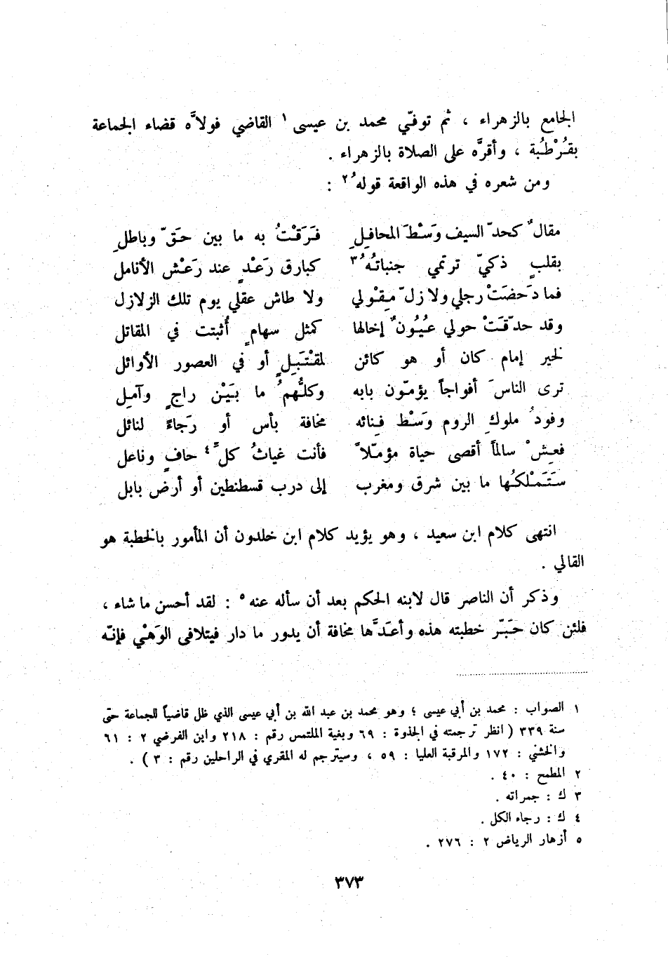 (1) الصواب: محمد بن أبي عيسى؛ وهو محمد بن عبد الله بن أبي عيسى الذي زظل قاضياً للجماعة حتى سنة 339 (انظر تجمته في الجذوة: 69 وبغية الملتمس رقم: 218 وابن الفرضي 2: 61 والخشني: 172 والمرقبة العليا: 59، وسيترجم له المقري في الراحلين رقم: 3) .