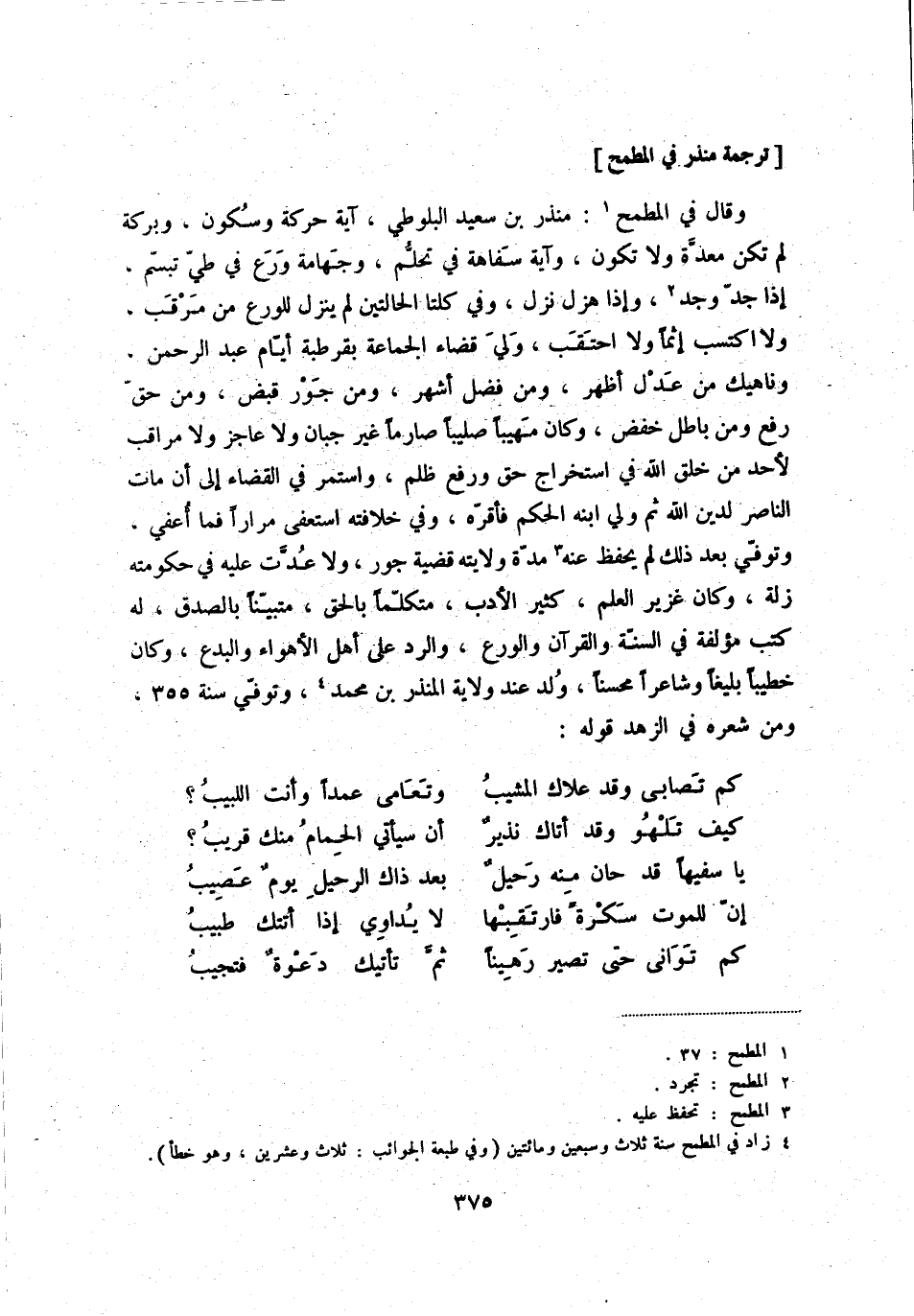 وقال في المطمح (1) : منذر بن سعيد البلوطي، آية حركة وسكون، وبركة لم تكن معدّة ولا تكون، وآية سفاهة في تحلّم، وجهامة ورع في طيّ تبسّم، إذا جدّ وجد (2) ، وإذا هزل نزل، وفي كلتا الحالتين لم ينزل للورع من مرقب، ولا اكتسب إثماً ولا احتقب، ولي قضاء الجماعة بقرطبة أيّام عبد الرحمن، وناهيك من عدل أظهر، ومن فضل أشهر، ومن جور قبض، ومن حقّ رفع ومن باطل خفض، وكان مهيباً صليباً صارماً غير جبان ولا عاجز ولا مراقب لأحد من خلق الله في استخراج حق ورفع ظلم، واستمر في القضاء إلى أن مات الناصر لدين الله ثم ولي ابنه الحكم فأقرّه، في خلافته استعفى مراراً فما أعفي، وتوفّي بعد ذلك لم يحفظ عنه (3) مدّة ولايته قضية جور، ولا عدّت عليه في حكومته زلة، وكان غزير العلم، كثير الأدب، متكلّماً بالحق، متبيّناً بالصدق، له كتب مؤلفة في السنّة والقرآن والورع، والرد على أهل الأهواء والبدع، وكان خطيباً بليغاً وشاعراً محسناً، ولد عند ولاية المنذر بن محمد (4) ، وتوفّي سنة 355، ومن شعره في الزهد قوله: