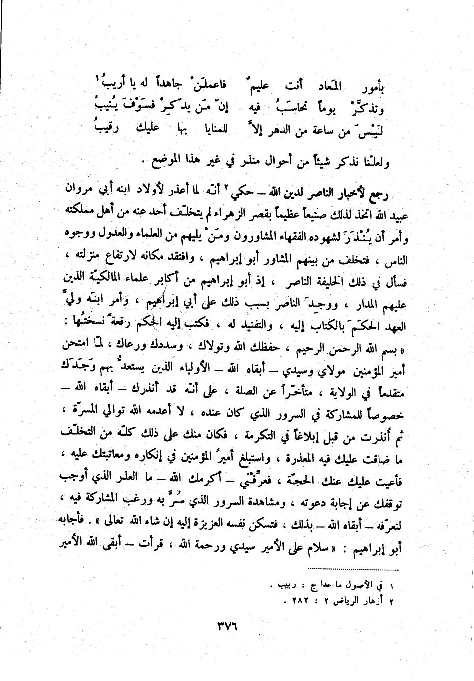 رجع لأخبار الناصر لدين الله - حكي (2) أنّه لما أعذر لأولاد ابنه أبي مروان عبيد الله اتخذ لذلك صنيعاً عظيماً بقصر الزهراء لم يتخلّف أحد عنه من أهل مملكته وأمر أن ينذر لشهوده الفقهاء المشاورون ومن يليهم من العلماء والعدول ووجوه الناس، فتخلف من بينهم المشاور أبو إبراهيم، وافتقد مكانه لارتفاع منزلته، فسأل في ذلك الخليفة الناصر، إذ أبو إبراهيم من أكابر علماء المالكيّة الذي عليهم المدار، ووجد الناصر بسبب ذلك على أبي إبراهيم، وأمر ابنه وليّ العهد الحكم بالكتاب إليه، والتفنيد له، فكتب إليه الحكم رقعةً نسختها: بسم الله الرحمن الرحيم، حفظك الله وتولاك، وسددك ورعاك، لمّا امتحن أمير المؤمنين مولاي وسيدي - أبقاه الله - الأولياء الذي يستعدّ بهم وجدك متقدماً في الولاية، متأخّراً عن الصلة، على أنّه قد أنذرك - أبقاه الله - خصوصاً للمشاركة في السرور الذي كان عنده، لا أعدمه الله توالي المسرّة، ثم أنذرت من قبل إبلاغاً في التكرمة، فكان منك على ذلك كلّه من التخلّف ما ضاقت عليك فيه المعذرة، واستبلغ أمير المؤمنين في إنكاره ومعاتبتك عليهن فأعيت عليك عنك الحجّة، فعرّفني - أكرمك الله - ما الذر الذي أوجب توقفك عن إجابة دعوته، ومشاهدة السرور الذي سرّبه وغب المشاركة فيه، لنعرّفه - أبقاه الله - بذلك، فتسكن نفسه العزيزة غليه إن شاء الله تعالى. فأجابه أبو إبراهيم: سلام على الأمير سيدي ورحمة الله، قرأت - أبقى الله الأمير