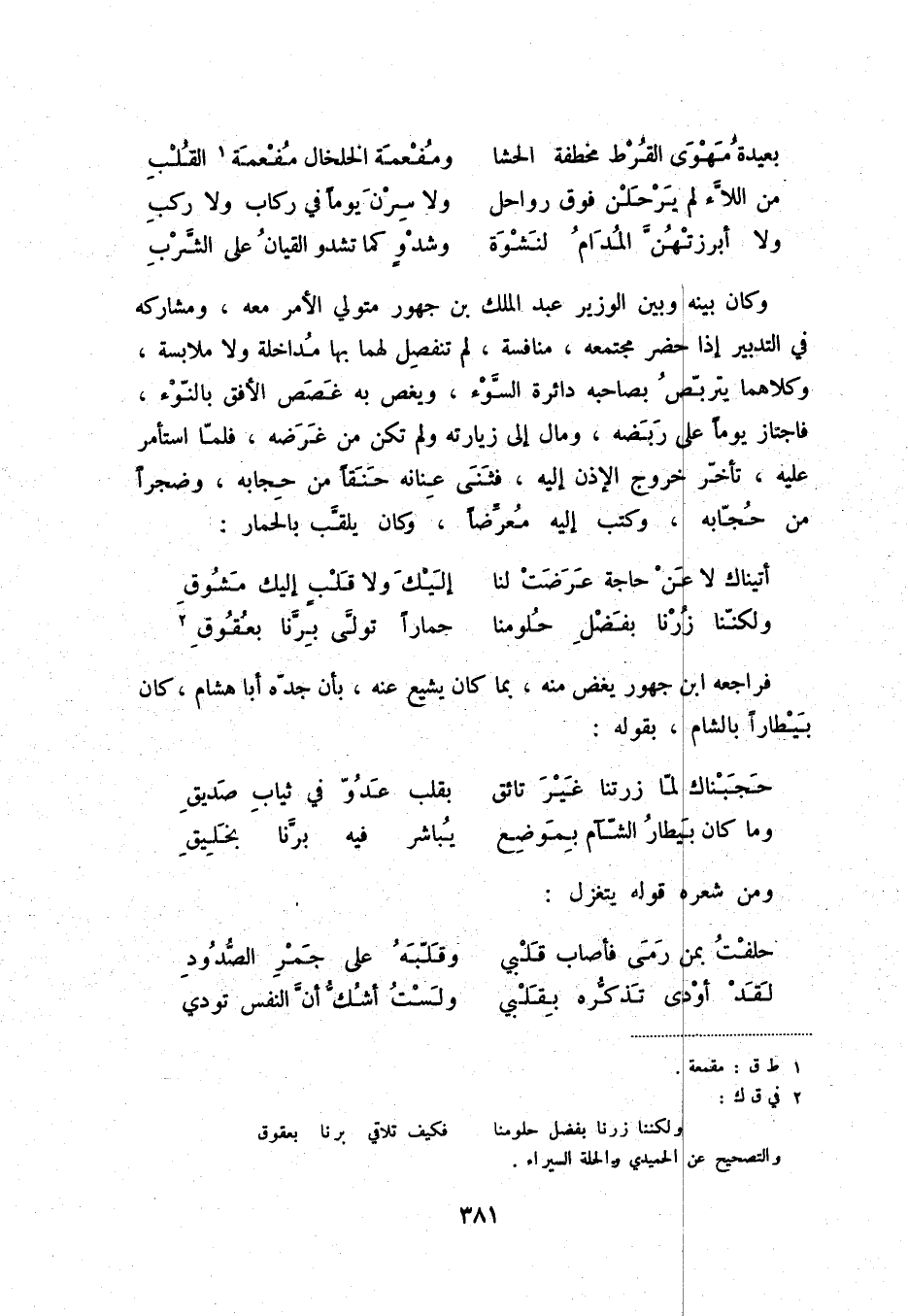 ولا أبرزتهنّ المدام لنشوة ... وشدوٍ كما تشدو القيان على الشّرب وكان بينه وبين الوزير عبد الملك بن جهور متولي الأمر معه، ومشاركه في التدبير إذا حضر مجتمعه، منافسة، لم تنفصل لهما بها مداخلة ولا ملابسة، وكلاهما يتربّص بصاحبه دائرة السّوء، ويغص به غصص الأفق بالنّوء، فاجتاز يوماً على ربضه، وما إلى زيارته ولم تكن من غرضه، فلمّا استأمر عليه، تأخر خروج الإذن إليه، فثنى عنانه حنقاً من حجابه، وضجراً من حجّابه، وكتب إليه معرّضاً، وكان يلقّب بالحمار: