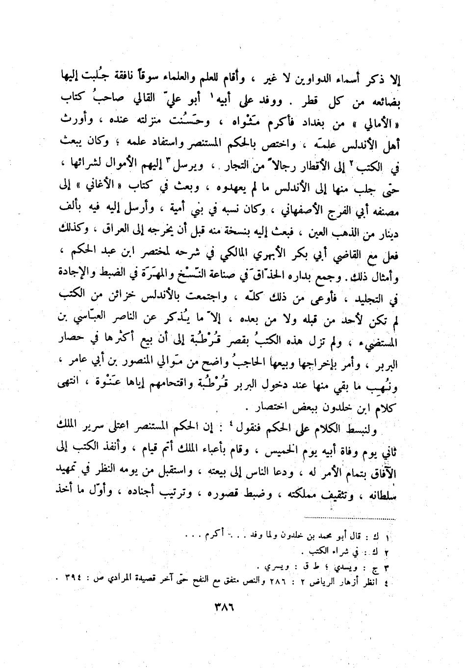 إلا ذكر أسماء الدواوين لا غير، وأقام للعلم والعلماء سوقاً نافقة جلبت إليها بضائعه من كل قطر. ووفد على أبيه (1) أبو عليّ القالي صاحب كتاب الأمالي من بغداد فأكرم مثواه، وحسنت منزلته عنده، وأورث أهل الأندلس علمه، واختص بالحكم المستنصر واستفاد علمه؛ وكان يبعث في الكتب (2) إلى الأقطار رجالاً من التجار، ويرسل (3) إليهم الأموال لشرائها، حتى جلب منها إلى الأندلس ما لم يعهدوه، وبعث في كتاب الأغاني إلى مصنفه أبي الفرج الأصفهاني، وكان نسبه في بني أمية، وأرسل إليه فيه بألف دينار من الذهب العين، فبعث إليه بنسخة منه قبل أن يخرجه إلى العراق، وكذلك فعل مع القاضي أبي بكر الأبهري المالكي في شرحه لمختصر ابن عبد الحكم، وأمثال ذلك. وجمع بداره الحذّاق في صناعة النّسخ والمهرة في الضبط والإجادة في التجليد، فأوعى من ذلك كلّه، واجتمعت بالأندلس خزائن من الكتب لم تكن لأحد من قبله ولا من بعده، إلاّ ما يذكر عن الناصر العباسيّ بن المستضيء، ولم تزل هذه الكتب بقصر قرطبة إلى أن بيع أكثرها في حصار البربر، وأمر بإخراجها وبيعها الحاجب واضح من موالي المنصور بن أبي عامر، ونهب ما بقي منها عند دخول البربر قرطبة واقتحامهم إياها عنوة، انتهى كلام ابن خلدون ببعض اختصار.