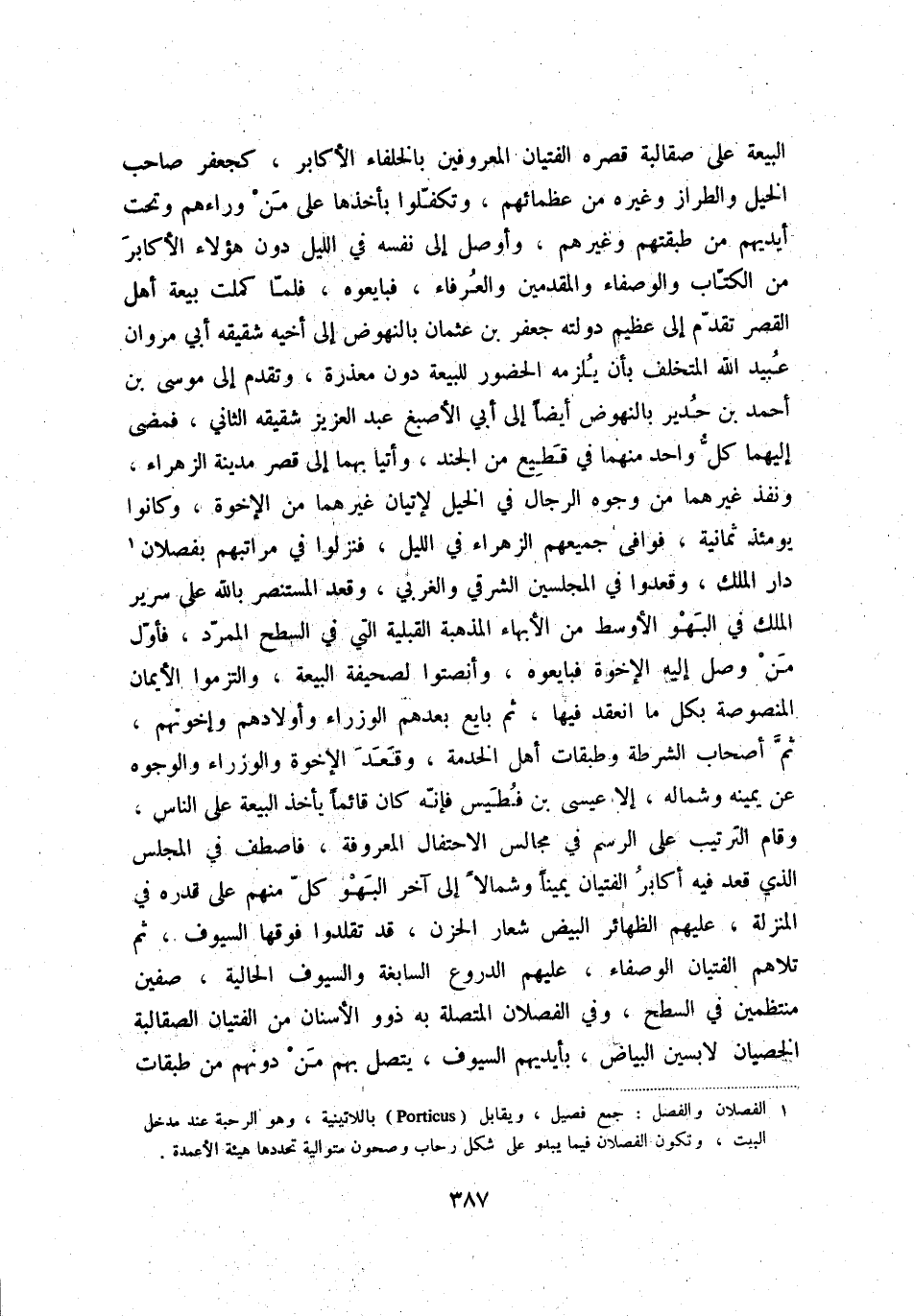 البيعة على صقالبة قصره الفتيان المعروفين بالخلفاء الأكابر، كجعفر صاحب الخيل والطراز وغيره من عظمائهم، وتكفّلوا بأخذها على من وراءهم وتحت أيديهم من طبقتهم وغيرهم، وأوصل إلى نفسه في الليل دون هؤلاء الأكابر من الكتّاب والوصفاء والمقدمين والعرفاء، فبايعوه، فلمّا كملت بيعة أهل القصر تقدّم إلى عظيم دولته جعفر بن عثمان بالنهوض إلى أخيه شقيقه أبي مروان عبيد الله المتخلف بأن يلزمه الحضور للبيعة دون معذرة، وتقدم إلى موسى بن أحمد بن حدير بالنهوض أيضاً إلى ابي الأصبغ عبد العزيز شقيقه الثاني، فمضى إليهما كلّ واحد منهما في قطيع من الجند، وأتيا بهما إلى قصر مدينة الزهراء، ونفذ غيرهما من وجوه الرجال في الخيل لإتيان غيرهما من الإخوة، وكانوا يومئذ ثمانية، فوافى جميعهم الزهراء في الليل، فنزلوا في مراتبهم بفصلان (1) دار الملك، وقعدوا في المجلسين الشرقي والغربي، وقعد المستنصر بالله على سرير الملك في البهو الوسط من الأبهاء المذهبة القبلية التي في السطح الممرّد، فأوّل من وصل إليه الإخوة فبايعوه، وأنصتوا لصحيفة البيعة، والتزموا الأيمان المنصوصة بكل ما انعقد فيها، ثم بايع بعدهم الوزراء وأولادهم وإخوتهم، ثمّ أصحاب الشرطة وطبقات أهل الخدمة، وقعد الإخوة والوزراء والوجوه عن يمينه وشماله، إلا عيسى بن فطيس فإنّه كان قائماً يأخذ البيعة على الناس، وقام الترتيب على الرسم في مجالس الاحتفال المعروفة، فاصطف في المجلس الذي قعد فيه أكابر الفتيان يميناً وشمالاً إلى آخر البهو كلّ منهم على قدره في المنزلة، عليهم الظهائر البيض شعار الحزن، قد تقلدوا فوقها السيوف، ثم تلاهم الفتيان الوصفاء، عليهم الدروع السابغة والسيوف الحالية، صفين منتظمين في السطح، وفي الفصلان المتصلة به ذوو الأسنان من الفتيان الصقالبة الخصيان لابسين البياض، بأيديهم السيوف، يتصل بهم من دونهم من طبقات