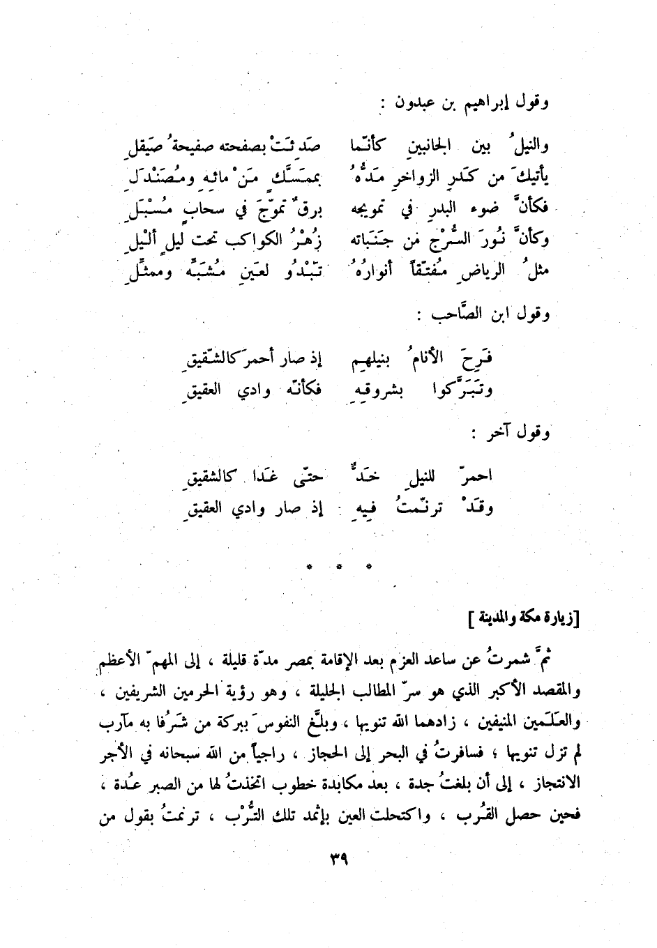 ثم شمرت عن ساعد العزم بعد الإقامة بمصر مدة قليلة، إلى المهم الأعظم والمقصد الأكبر الذي هو سر المطالب الجليلة، وهو رؤية الحرمين الشريفين، والعلمين المنيفين، زادهما الله تنويها، وبلغ النفوس ببركة من شرفا به مآرب لم تزل تنويها؛ فسافرت في البحر إلى الحجاز، راجياً من الله سبحانه في الأجر الانتجاز، إلى أن بلغت جدة، بعد مكابدة خطوب اتخذت لها من الصبر عدة، فحين حصل القرب، واكتحلت العين بإثمد تلك الترب، ترنمت بقول من