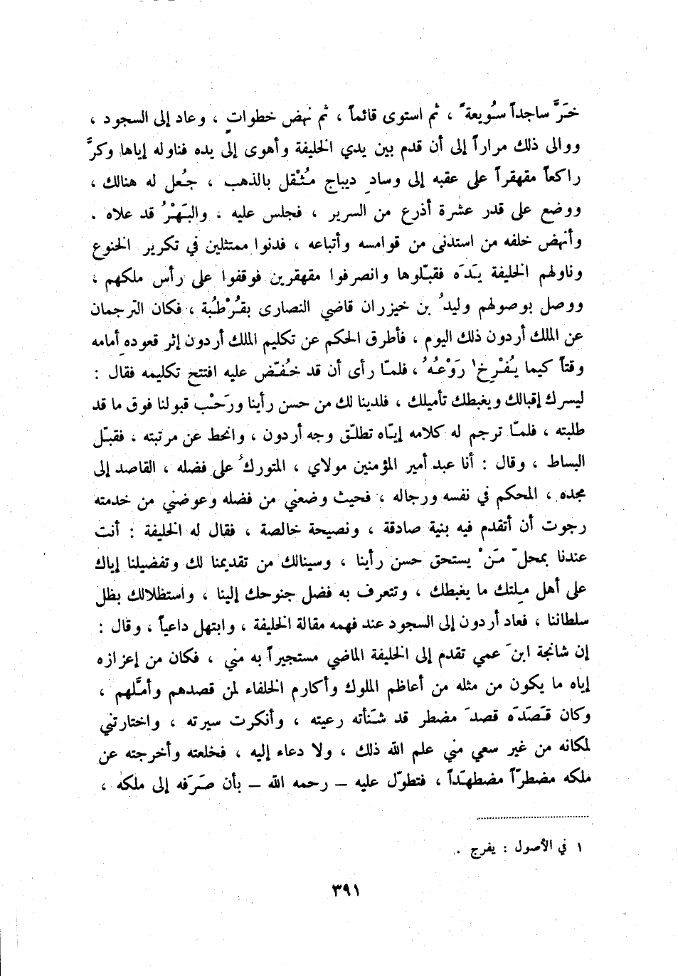 خرّ ساجداً سويعةً، ثم استوى قائماً، ثم نهض خطواتٍ، وعاد إلى السجود ووالى ذلك مراراً إلى أن قدم بين يدي الخليفة وأهوى إلى يده فناوله إياها وكرّ راكعاً مقهقراً على عقبه إلى وساد ديباج مثقل بالذهب، جعل له هنالك، ووضع على قدر عشرة أذرع من السرير، فجلس عليه، والبهر قد علاه، وأنهض خلفه من استدنى من قوامسه وأبتاعه، فدنوا ممتثلين في تكرير الخنوع وناولهم الخليفة يده فقبّلوها وانصرفوا مقهقرين فوقفوا على رأس ملكهم، ووصل بوصولهم وليد بن خيزران قاضي النصارى بقرطبة، فكان الترجمان عن الملك أردون ذلك اليوم، فأطرق الحكم عن تكليم الملك أردون إثر قعوده أمامه وقتاً كيما يفرخ (1) روعه، فلمّا رأى أن قد خفّض عله افتتح تكليمه فقال: ليسرك إقبالك ويغبطك تأميلك،