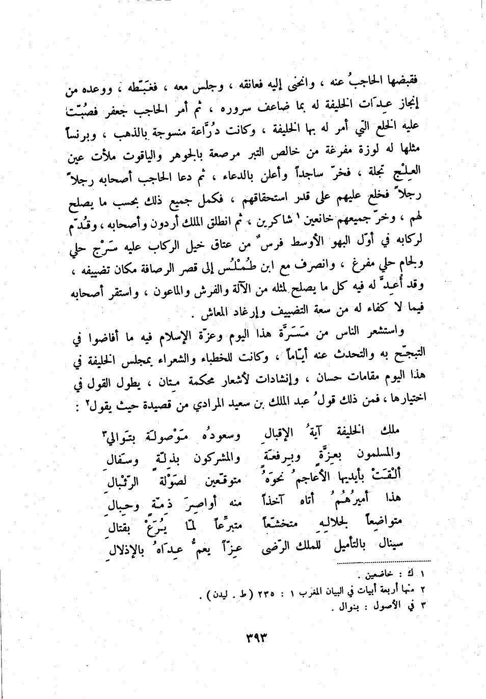 فقبضها الحاجب عنه، وانحنى إليه فعانقه، وجلس معه، فغبّطه، ووعده من إنجاز عدات الخليفة له بما ضاعف سروره، ثم أمر الحاجب جعفر فصبت عليه الخلع التي أمر له بها الخليفة، وكانت درّاعة منسوجة بالذهب، وبرنساً مثلها له لوزة مفرغة من خالص البر مرصعة بالجوهر والياقوت ملأت عين العلج تجلة، فخرّ ساجداً وأعلن بالدعاء، ثم دعا الحاجب أصحابه رجلاً رجلاً فخلع عليهم على قدر استحقاقهم، فكمل جميع ذلك بحسب ما يصلح لهم، وخرّ جميعهم خانعين (1) شاكرين، ثم انطلق الملك أردون وأصحابه، وقدّم لركابه في أوّل البهو الأوسط فرسٌ من عتاق خيل الركاب عليه سرج حلي ولجام حلي مفرغ، وانصرف مع ابن طملس إلى قصر الرصافة مكان تضييفه، وقد أعدّ له فيه كل ما يصلح لمثله من الآلة والفرش والماعون، واستقر أصحابه فيما لا كفاء له من سعة التضييف وإرغاد المعاش.