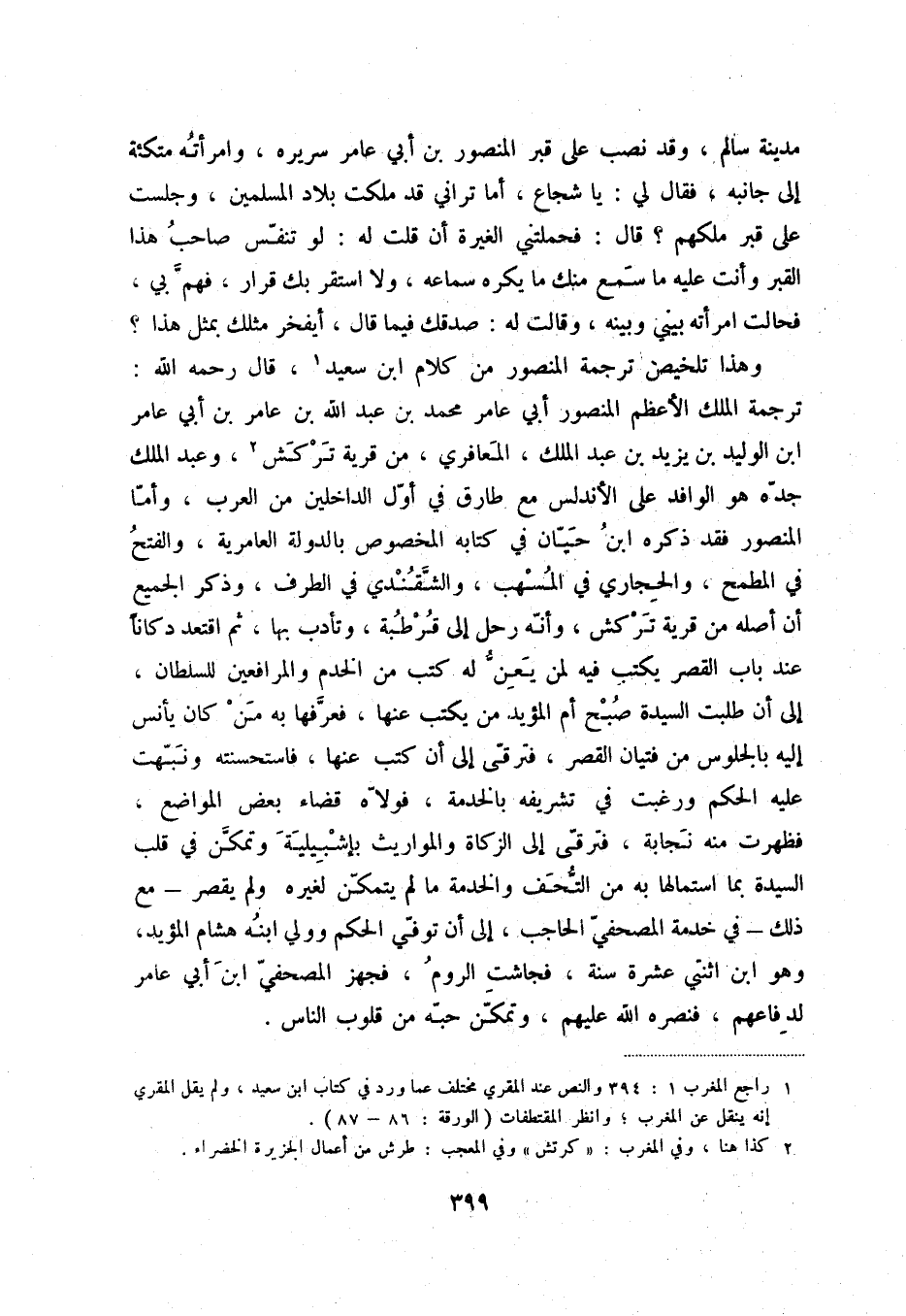 (1) راجع المغرب 1: 394 والنص عند المقري مختلف عما ورد في كتاب ابن سعيد، ولم يقل المقري إنه ينقل عن المغرب؛ وانظر المقتطفات (الورقة: 86 - 87) .