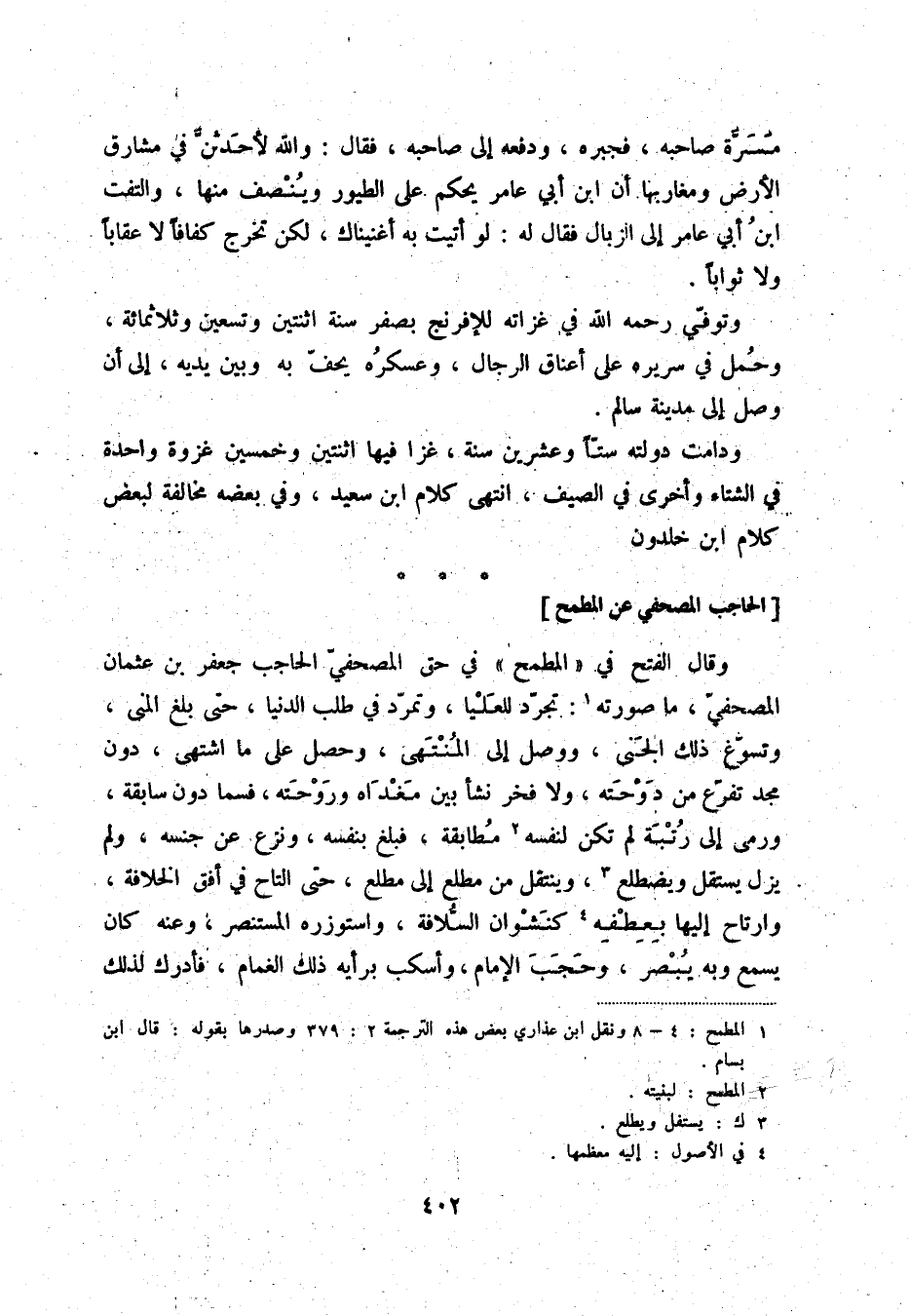 وقال الفتح في " المطمح " في حق المصحفيّ الحاجب جعفر بن عثمان المصحفيّ، ما صورته (1) : تجرّد للعليا، وتمرّد في طلب الدنيا، حتى بلغ المنى، وتسوّغ ذلك الجنى، ووصل إلى المنتهى، وحصل على ما اشتهى، دون مجد تفرّع من دوحته، ولا فخر نشأ بين مغداه وروحته، فسما دون سابقة، ورمى إلى رتبة لم تكن لنفسه (2) مطابقة، فبلغ بنفسه، ونزع عن جنسه، ولم يزل يستقل ويضطلع (3) ، وينتقل من مطلع إلى مطلع، حتى التاح في أفق الخلافة، وارتاح إليها بعطفه (4) كنشوان السّلافة، واستوزره المستنصر، وعنه كان يسمع وبه يبصر، وحجب الإمام، وأسكب برأيه ذلك الغمام، فأدرك لذلك