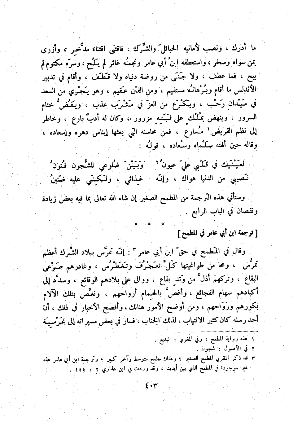 (3) قد ذكر المقري المطمح الصغير؛ وهناك مطمح متوسط وآخر كبير؛ وترجمة ابن أبي عامر هذه غير موجودة في المطمح الذي بين أيدينا، وقد وردت في ان عذاري 2: 444.