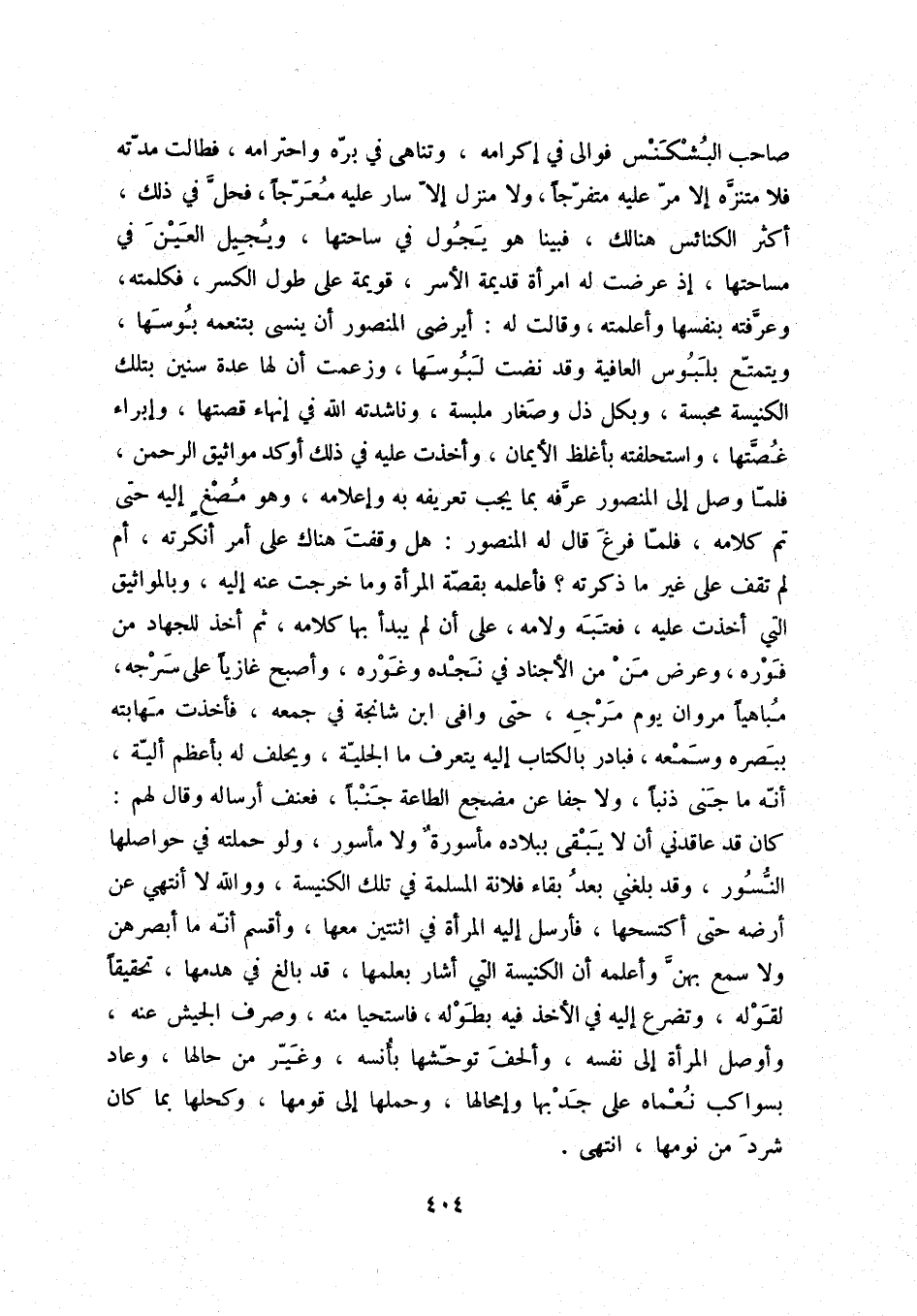 صاحب البشكنس فوالى في إكرامه، وتناهى في برّه واحترامه، فطالت مدّته فلا متنزّه إلا مرّ عليه متفرّجاً، ولا منزل إلاّ سار عليه معرّجاً، فحلّ في ذلك، أكثر الكنائس هنالك، فبينا هو يجول في ساحتها، ويجيل العين في مساحتها، إذ عرضت له امرأة قديمة الأسر، قويمة على طول الكسر، فكلمته، وعرّفته بنفسها وأعلمته، وقالت له: أيرضى المنصور أن ينسى بتنعمه بوسها، ويتمتّع بلبوس العافية وقد نضت لبوسها، وزعمت أن لها عدة سنين بتلك الكنيسة محبسة، وبكل ذل وصغار ملبسة، وناشدته الله في إنهاء قصتها، وإبراء غصّتها، واستحلفته بأغلظ الأيمان، وأخذت عليه في ذلك أوكد مواثيق الرحمن، فلمّا وصل إلى المنصور عرّفه بما يجب تعريفه به وإعلامه، وهو مصغٍ إليه حتى تم كلامه، فلمّا فرغ قال له المنصور: هل وقفت هناك على أمر أنكرته، أم لم تقف على غير ما ذكرته؟ فأعلمه بقصّة المرأة وما خرجت عنه إليه، وبالمواثيق التي أخذت عليه، فعتبه ولامه، على أن لم يبدأ بها كلامه، ثم أخذ للجهاد من فوره، وعرض من من الأجناد في نجده وغوره، وأصبح غازياً على سرجه، مباهياً مروان يوم مرجه، حتى وافى ابن شانجة في جمعه، فأخذت مهابته ببصره وسمعه، فبادر بالكتاب إليه يتعرف ما الجليّة، ويحلف له بأعظم أليّة، أنّه ما جنى ذنباً، ولا جفا عن مضجع الطاعة جنباً، فعنف أرساله وقال لهم: كان قد عاقدني أن لا يبقى ببلاده مأسورةٌ ولا مأسور، ولو حملته في حواصلها النّسور، وقد بلغني بعد بقاء فلانة المسلمة في تلك الكنيسة، ووالله لا أنتهي عن أرضه حتى أكتسحها، فأرسل إليه المرأة في اثنتين معها، وأقسم أنّه ما أبصرهن ولا سمع بهنّ وأعلمه أن الكنيسة التي أشار بعلمها، قد بالغ في هدمها، تحقيقاً لقوله، وتضرع إليه في الأخذ في بطوله، فاستحيا منه، وصرف الجيش عنه، وأوصل المرأة إلى نفسه، وألحف توحّشها بأنسه، وغيّر من حالها، وعاد بسواكب نعماه على جدبها وإمحالها، وحملها إلى قومها، وكحلها بما كان شرد من نومها، انتهى.