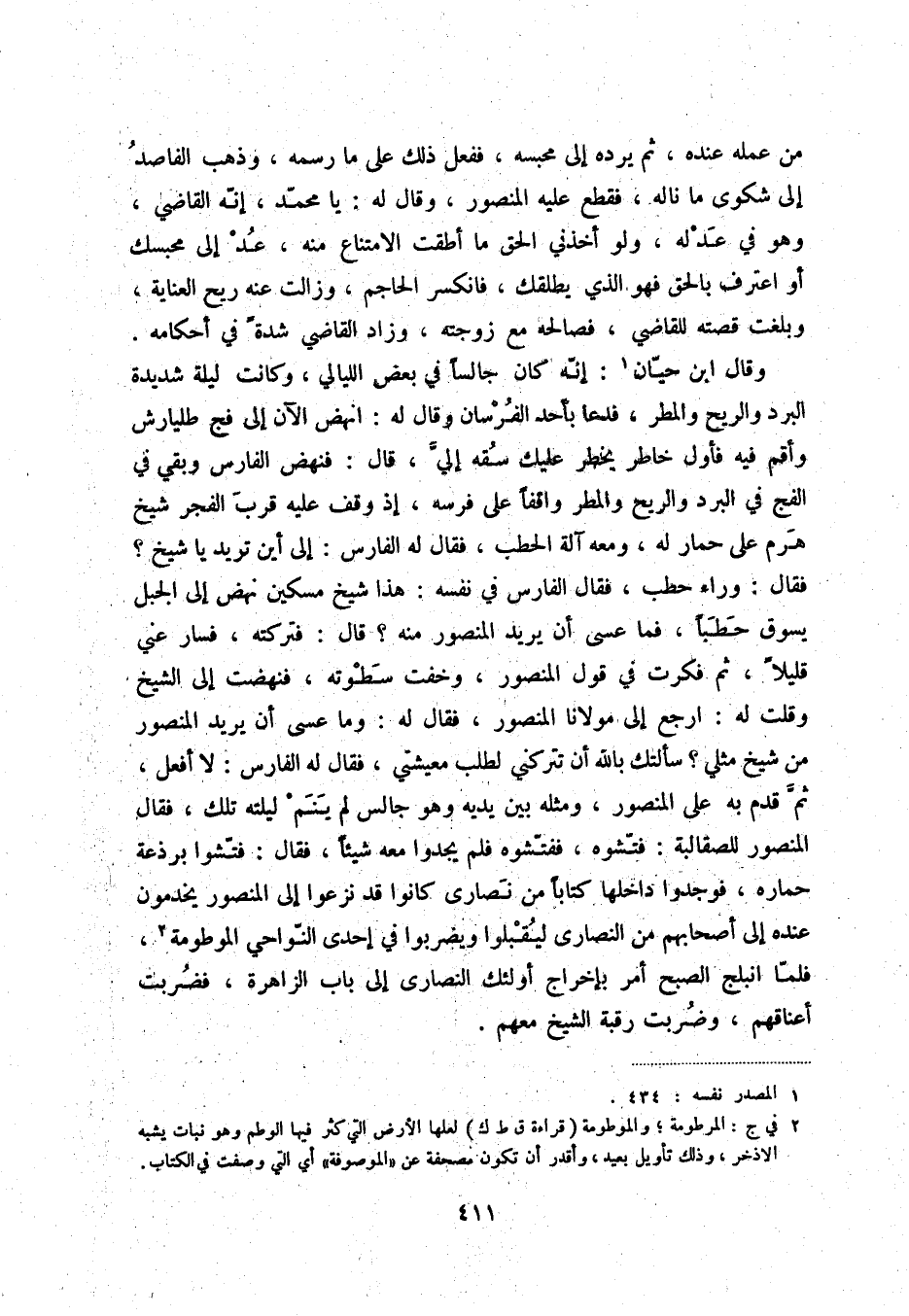 وقال ابن حيّان (1) : إنّه كان جالساً في بعض الليالي، وكانت ليلة شديدة البرد والريح والمطر، فدعا بأحد الفرسان وقال له: انهض الآن إلى فج طليارش وأقم فيه فأول خاطر يخطر عليك سقه إليّ، قال: فنهض الفارس وبقي في الفج في البرد والريح والمطر واقفاً على فرسه، إذ وقف عليه قرب الفجر شيخ هرم على حمار له، ومعه آلة الحطب، فقال له الفارس: إلى أين تريد يا شيخ؟ فقال: وراء حطب، فقال الفارس في نفسه: هذا شيخ مسكين نهض إلى الجبل يسوق حطباً، فما عسى أن يريد المنصور منه؟ قال: فتركته، فسار عني قليلاً، ثم فكرت في قول المنصور، وخفت سطوته، فنهضت إلى الشيخ وقلت له: ارجع إلى مولانا المنصور، فقال له: وما عسى أن يريد المنصور من شيخ مثلي؟ سألتك بالله أن تتركني لطلب معيشتي، فقال له الفارس: لا أفعل، ثمّ قدم به على المنصور، ومثله بين يديه وهو جالس لم ينم ليلته تلك، فقال المنصور للصقالبة: فتّشوه، ففتّشوه فلم يجدوا معه شيئاً، فقال: فتّشوا برذعة حماره، فوجدوا داخلها كتاباً من نصارى كانوا قد نزعوا إلى المنصور يخدمون عنده إلى أصحابهم من النصارى ليقبلوا ويضربوا في إحدى النّواحي الموطومة (2) ، فلمّا انبلج الصبح أمر بإخراج أولئك النصارى إلى باب الزاهرة، فضربت أعناقهم، وضربت رقبة الشيخ معهم.