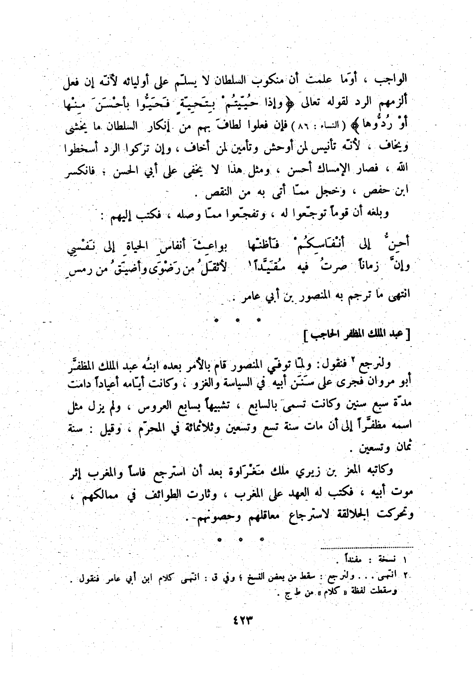 ولنرجع (2) فنقول: ولمّا توفّي المنصور قام بالأمر بعده ابنه عبد الملك المظفّر أبو مروان فجرى على سنن أبيه في السياسة والغزو، وكانت أيّامه أعياداً دامت مدّة سبع سنين وكانت تسمى بالسابع، تشبيهاً بسابع العروس، ولم يزل مثل اسمه مظفّراً إلى أن مات سنة تسع وتسعين وثلاثمائة في المحرّم، وقيل: سنة ثمان وتسعين.