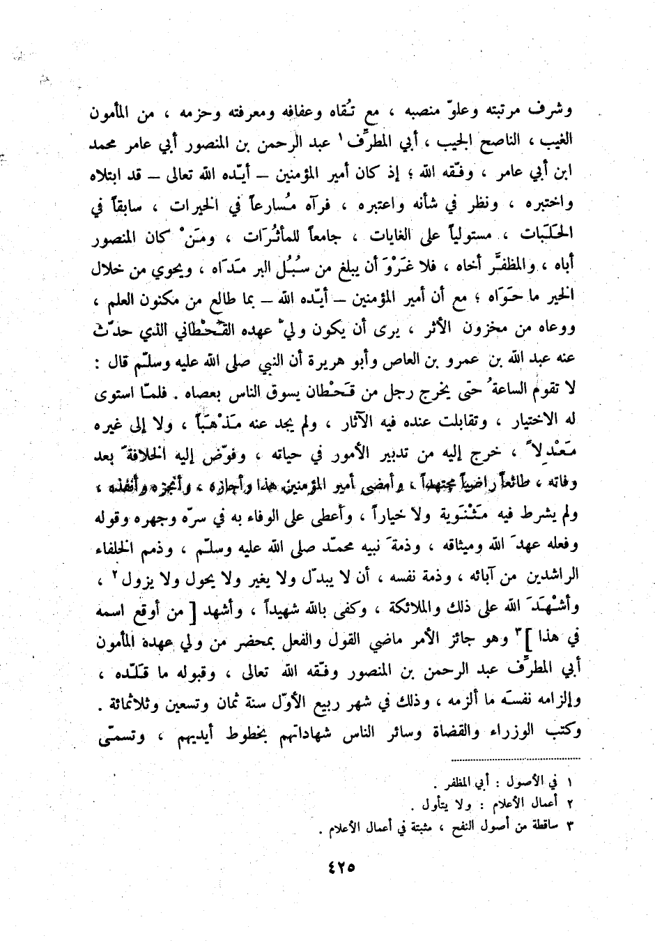 وشرف مرتبته وعلوّ منصبه، مع تقاه وعفافه ومعرفته وحزمه، من المأمون الغيب، الناصح الجيب، أبي المطرّف (1) عبد الرحمن بن المنصور أبي عامر محمد بن أبي عامر، وفّقه الله؛ إذ كان أمير المؤمنين - أيّده الله تعالى - قد ابتلاه واختره، ونظر في شأنه واعتبره، فرآه مسارعاً في الخيرات، سابقاً في الحلبات، مستولياً على الغايات، جامعاً للمأثرات، ومن كان المنصور أباه، والمظفّر أخاه، فلا غرو أن يبلغ من سبل البر مداه، ويحوي من خلال الخير ما حواه؛ مع أن أمير المؤمنين؟ أيّده الله؟ بما طالع من مكنون العلم، ووعاه من مخزون الأثر، يرى أن يكون وليّ عهده القحطاني الذي حدّث عنه عبد الله بن عمرو بن العاص وأبو هريرة أن النبي صلى الله عليه وسلّم قال: " لا تقوم الساعة حتى يخرج رجل من قحطان يسوق الناس بعصاه ". فلما استوى له الاختيار وتقابلت عنده فيه الآثار، ولم يجد عنه مذهباً، ولا إلى غيره معدلاً، خرج إليه من تدبير الأمور في حياته، وفوّض إليه الخلافة بعد وفاته، طائعاً راضياً مجتهداً، وأمضى أمير المؤمنين هذا وأجازه، وأنجزه وأنفذه، ولم يشرط فيه مثنوية ولا خياراً، وأعطى على الوفاء به في سرّه وجهره وقوله وفعله عهد الله وميثاقه، وذمة نبيه محمّد صلى الله عليه وسلّم، وذمم الخلفاء الراشدين من آبائه، وذمة نفسه، أن لا يبدّل ولا يغير ولا يحول ولا يزول (2) ، وأشهد الله على ذلك والملائكة، وكفى بالله شهيداً، وأشهد [من أوقع اسمه في هذا] (3) وهو جائز الأمر ماضي القول والفعل بمحضر من ولي عهده المأمون أبي المطرّف عبد الرحمن بن المنصور وفّقه الله تعالى، وقبوله ما قلّده، وإلزامه نفسه ما ألزمه، وذلك في شهر ربيع الأوّل سنة ثمان وتسعين وثلاثمائة. وكتب الوزراء والقضاة وسائر الناس شهاداتهم بخطوط أيديهم، وتسمّى