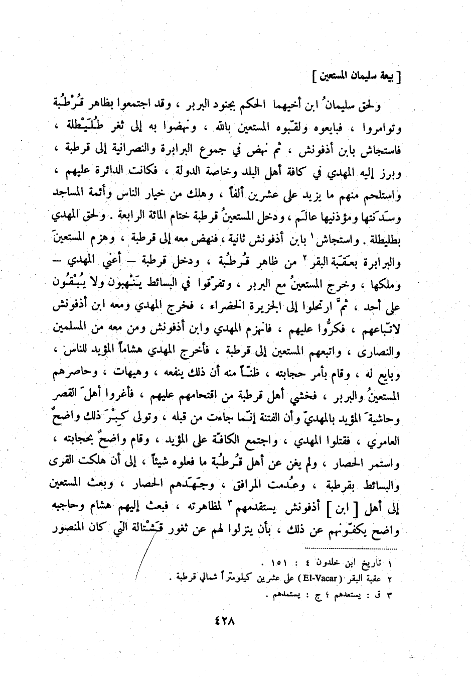 ولحق سليمان ابن أخيهما الحكم بجنود البربر، وقد اجتمعوا بظاهر قرطبة وتوامروا، فبايعوه ولقّ؟ بوه المستعين بالله، ونهضوا به إلى ثغر طليطلة، فاستجاش بابن أذفونش، ثم نهض في جموع البرابرة والنصرانية إلى قرطبة، وبرز إليه المهدي في كافة أهل البلد وخاصة الدولة، فكانت الدائرة عليهم، واستلحم منهم ما يزيد على عشرين ألفاً، وهلك من خيار الناس وأئمة المساجد وسدنتها ومؤذنيها عالم، ودخل المستعين قرطبة ختام المائة الرابعة. ولحق المهدي بطليطلة. واستجاش (1) بابن أذفونش ثانية، فنهض معه إلى قرطبة، وهزم المستعين والبرابرة بعقبة البقر (2) من ظاهر قرطبة، ودخل قرطبة - أعني المهدي - وملكها، وخرج المستعين مع البربر، وتفرّقوا في البسائط ينهبون ولا يبقون على أحد، ثمّ ارتحلوا إلى الجزيرة الخضراء، فخرج المهدي ومعه ابن أذفونش لاتّباعهم، فكرّوا عليهم، فانهزم المهدي وابن أذفونش ومن معه من المسلمين والنصارى، وابتعهم المستعين إلى قرطبة، فأخرج المهدي هشاماً المؤيد للناس، وبايع له، وقام بأمر حجابتهن ظنّاً منه أن ذلك ينفعه، وهيهات، وحاصرهم وحاشية المؤيد بالمهديّ وأن الفتنة إنّما جاءت من قبله، وتولى كبر ذلك واضحٌ العامري، فقالوا المهديّ، واجتمع الكافّة على المؤيد، وقام واضحٌ بحجابته، واستمر الحصار، ولم يغن عن أهل قرطبة ما فعلوه شيئاً، إلى أن هلكت القرى والبسائط بقرطبة، وعدمت المرافق، وجهدهم الحصار، وبعث المستعين إلى أهل ابن أذفونش يستقدمهم (3) لمظاهرته، فبعث إليهم هشام وحاجبه واضح يكفّونهم عن ذلك، بأن ينزلوا لهم عن ثغور قشتالة التي كان المنصور