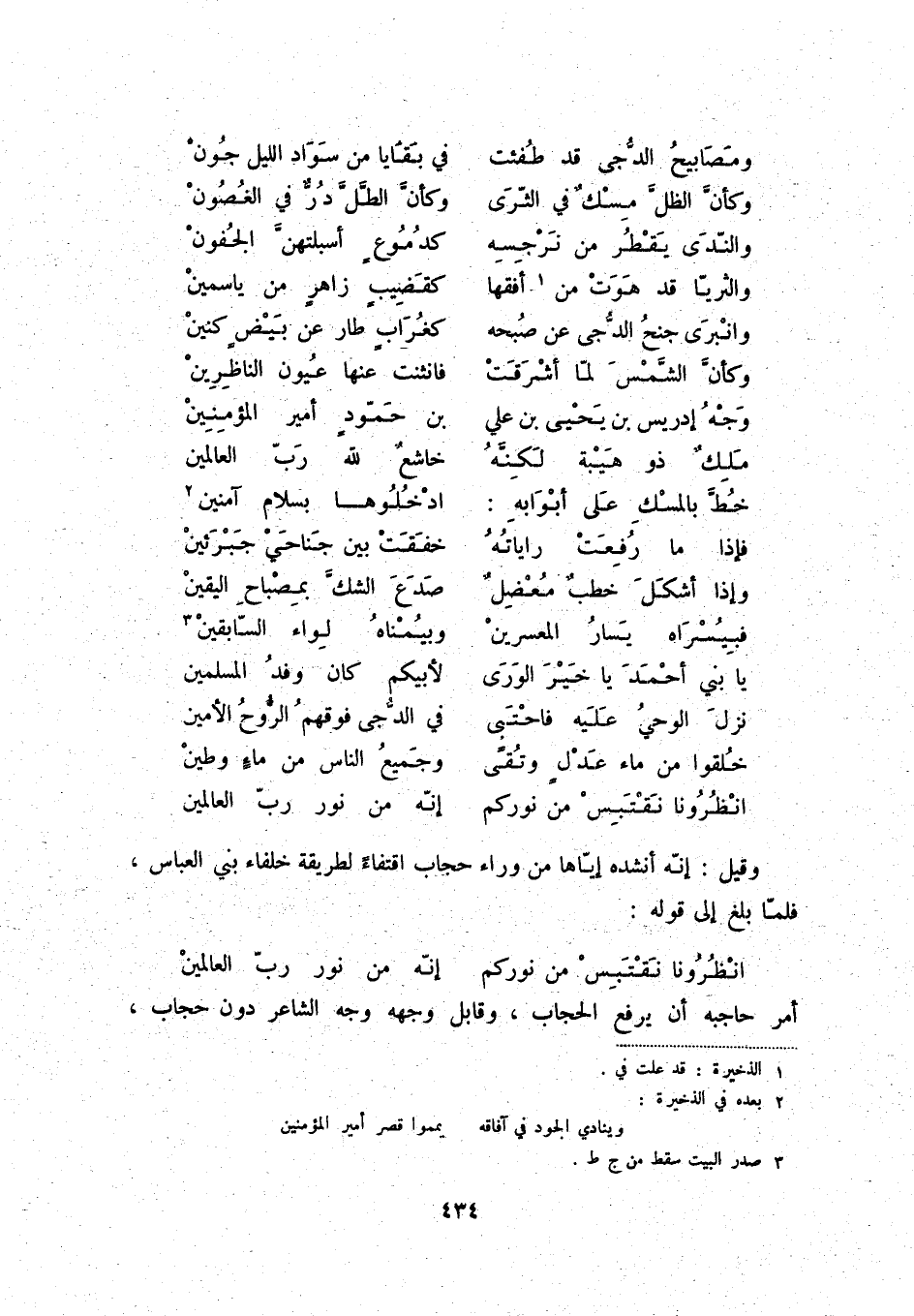 انظرونا نقتبس من نوركم ... إنّه من نور ربّ العالمين وقيل: إنّه أنشده إيّها من وراء حجاب اقتفاءً لطريقة خلفاء بني العباس، فلمّا بلغ إلى قوله:
