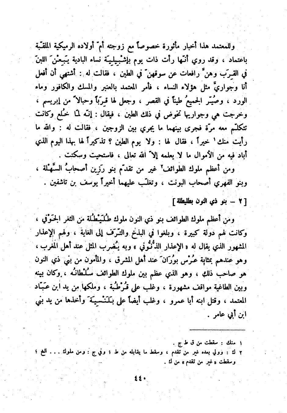 ومن أعظم ملوك الطوائف بنو ذي النون ملوك طليطلة من الثغر الجوفي، وكانت لهم دولة كبيرة، وبلغوا في البذخ والتّرف إلى الغاية، ولهم الإعذار المشهور الذي يقال له الإعذار الذّنّوني وبه يضرب المثل عند أهل المغرب، وهو عندهم بمثابة عرس بوران عند أهل المشرق، والمأمون من بني ذي النون هو صاحب ذلك، وهو الذي عظم بين ملوك الطوائف سلطانه، وكان بينه وبين الطاغية مواقف مشهورة، وغلب على قرطبة، وملكها من يد ابن عبّاد المعتمد، وقتل ابنه أبا عمرو، وغلب أيضاً على بلنسية وأخذها من يد بني ابن أبي عامر.