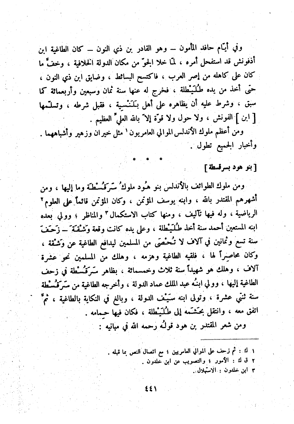 ومن ملوك الطوائف بالأندلس بنو هود ملوك سرقسطة وما إليها، ومن أشهرهم بالمقتدر بالله، وابنه يوسف المؤتمن، وكان المؤتمن قائماً على العلوم (2) الرياضية، وله فيها تآليف، ومنها كتاب الاستكمال (3) والمناظر؛ وولي بعده ابنه المستعين أحمد سنة أخذ طليطلة، وعلى يده كانت وقعة وشقة - زحف سنة تسع وثمانين في آلاف لا تحصى من المسلمين ليدافع الطاغية عن وشقة، وكان محاصراً لها، فلقيه الطاغية وهزمه، وهلك من المسلمين نحو عشرة آلاف، وهلك هو شهيداً سنة ثلاث وخمسمائة، بظاهر سرقسطة في زحف الطاغية إليها، وولي ابنه عبد الملك عماد الدولة، وأخرجه الطاغية من سرقسطة سنة ثنتي عشرة، وتولى ابنه سيف الدولة، وبالغ في النكاية بالطاغية، ثمّ اتفق معه، وانتقل بحشمه إلى طليطلة، فكان فيها حمامه.