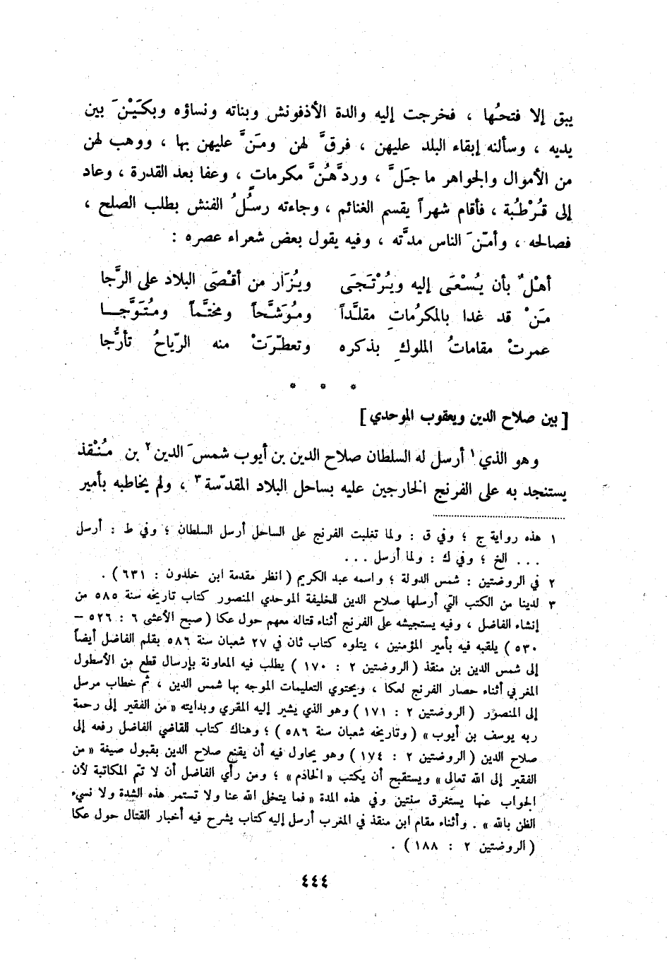(3) لدينا من الكتب التي رسلها صلاح الدين للخليفة الموحدي المنصور كتاب تاريخه سنة 585 من إنشاء الفاضل، وفيه يسجيشه على الفرنج أثناء قتاله معهم حول عكا (صبح الأعشى 6: 526 - 530) يلقبه فيه بأمير المؤمنين، يتلوه كتاب ثان في 27 شعبان سنة 586 بقلم الفاضل أيضاً إلى شمس الدين بن منقذ (الروضتين 2: 170) يطلب فيه المعاونة بإرسال قطع من الأسطول المغربي أثناء حصار الفرنج لعكا، ويحتوي التعليمات الموجه بها شمس الدين، ثم خطاب مرسل إلى المنصور (الروضتين 2: 171) وهو الذي يشير إليه المقري وبدايته " من الفقير إلى رحمة ربه يوسف بن أيوب " (وتاريخه شعبان سنة 586) ؛ وهناك كتاب للقاضي الفاضل رفعه إلى صلاح الدين (الروضتين 2: 174) وهو يحاول فيه أن يقنع صلاح الدين بقبول صيغة " من الفقير إلى الله تعالى " ويستقبح أن يكتب " الخادم "؛ ومن رأي الفاضل أن لا تتم المكاتة لأن الجواب عنها يستغرق سنتين وفي هذه المدة " فما يتخلى الله عنا ولا تستمر هذه الشدة ولا نسيء الظن بالله ". وأثناء مقام ابن منقذ في المغرب أرسل إليه كتاب يشرح فيه أخبار القتال حو مكا (الروضتين 2: 188) .