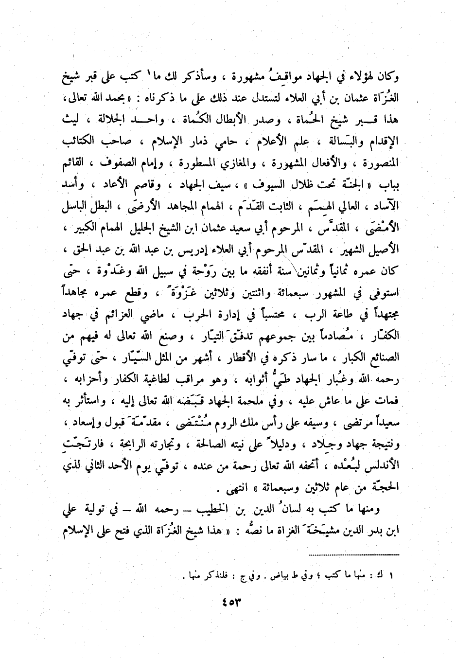 وكان لهؤلاء في الجهاد مواقف مشهورة، وسأذكر لك ما (1) كتب على قبر شيخ الغزاة عثمان بن أبي العلاء لتستدل عند ذلك على ما ذكرناه: بحمد الله تعالى هذا قبر شيخ الحماة، وصدر الأبطال الكماة، واحد الجلالة، ليث الإقدام والبسالة، علم الأعلام، حامي ذمار الإسلام، صاحب الكتائب المنصورة، والأفعال المشهورة، والمغازي المسطورة، وإمام الصفوف، القائم بباب الجنّة تحت ظلال السيوف، سيف الجهاد، وقاصم الأعاد، وأسد الآساد، العالي الهمم، الثابت القدم، الهمام المجاهد الأرضى، البطل الباسل الأمضى، المقدّس، المرحوم أبي سعيد عثمان ابن الشيخ الجليل الهمام الكبير، الأصيل الشهير، المقدّس المرحوم أبي العلاء إدريس بن عبد الله بن عبد الحق، كان عمره ثمانياً وثمانين سنة أنفقه ما بين روحة في سبيل الله وغدوة، حتى استوفى في المشهور سبعمائة واثنتين وثلاثين غزوةً، وقطع عمره مجاهداً مجتهداً في طاعة الرب، محتسباً في إدارة الحرب، ماضي العزائم في جهاد الكفّار، مصادماً بين جموعهم تدفّق التيّار، وصنع الله تعالى له فيهم من الصنائع الكبار، ما سار ذكره في الأقطار، أشهر من المثل السّيّار، حتى توفّي رحمه الله وغبار الجهاد طيّ أثوابه، وهو مراقب لطاغية الكفار وأحزابه، فمات على ما عاش عليه، وفي ملحمة الجهاد قبضه الله تعالى إليه، واستأثر يه سعيداً مرتضى، وسيفه على رأس ملك الروم منتضى، مقدّمة قبول وإسعاد، ونتيجة جهاد وجلاد، ودليلاً على نيته الصالحة، وتجارته الرابحة، فارتجّت الأندلس لبعده، أتحفه الله تعالى رحمة من عنده، توفّي يوم الأحد الثاني لذي الحجّة من عام ثلاثين وسبعمائة انتهى.