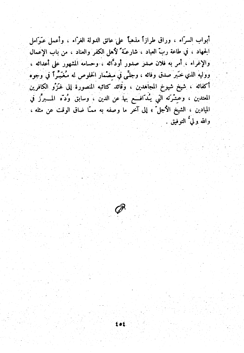 أبواب السرّاء، وراق طرازاً مذهباً على عاتق الدولة الغرّاء، وأعمل عوامل الجهاد، في طاعة ربّ العباد، شارعةً لأهل الكفر والعناد، من باب الإعمال والإغراء، أمر به فلان صدر صدور أودّائه، وحسامه المشهور على أعدائه، ووليه الذي خبر صدق وفائه، وجلّى في مضمار الخلوص له مغبّراً في وجوه أكفائه، شيخ شيوخ المجاهدين، وقائد كتائبه المنصورة إلى غزو الكافرين المعتدين، وعترته التي يدافع بها عن الدين، وسابق ودّه المبرّز في الميادين، الشيخ الأجل إلى آخر ما وصفه به ممّا ضاق الوقت عن مثله، والله وليّ التوفيق.