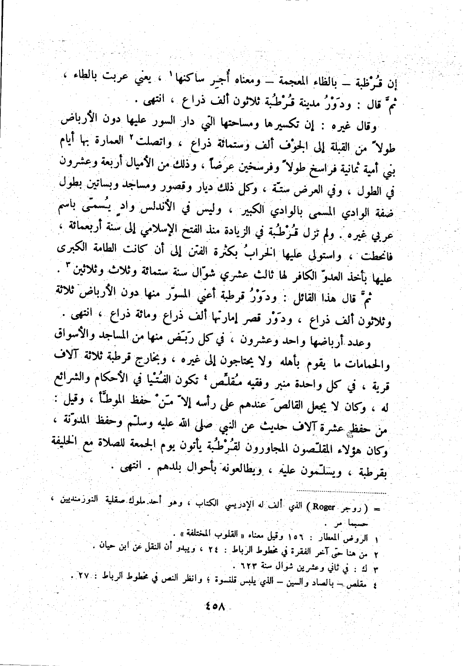 وعدد أرباضها واحد وعشرون، في كل ربض منها من المساجد والأسواق والحمامات ما يقوم بأهله ولا يحتاجون إلى غيره، وبخارج قرطبة ثلاثة آلاف قرية، في كل واحدة منبر وفقيه مقلّص (4) تكون الفتيا في الأحكام والشرائع له، وكان لا يجعل القالص عندهم على رأسه إلاّ من حفظ الموطّأ، وقيل: من حفظ عشرة آلاف حديث عن النبي صلى الله عليه وسلّم وحفظ المدوّنة، وكان هؤلاء المقلّصون المجاورون لقرطبة يأتون يوم الجمعة للصلاة مع الخليفة بقرطبة، ويسلّمون عليه، ويطالعونه بأحوال بلدهم. انتهى.