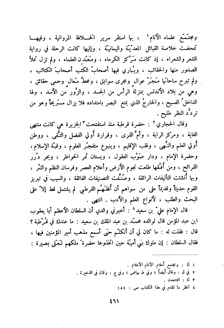 وقال الحجاري (2) : حضرة قرطبة منذ استفتحت (3) الجزيرة هي كانت منتهى الغاية، ومركز الراية، وأمّ القرى، وقرارة أولي الفضل والتّقى، ووطن أولي العلم والنّهى، وقلب الإقليم، وينبوع متفجّر العلوم، وقبّة الإسلام، وحضرة الإمام، ودار صوب العقول، وبستان ثمر الخواطر، وبحر درر القرائح، ومن أفقها طلعت نجوم الأرض وأعلام العصر وفرسان النظم والنثر، وبها أنشئت التأليفات الرائقة، والسبب في تبريز القوم حديثاً وقديماً على من سواهم أن أفقهم القرطبي لم يشتمل قط إلاّ على البحث والطلب، لأنواع العلم والأدب. انتهى.