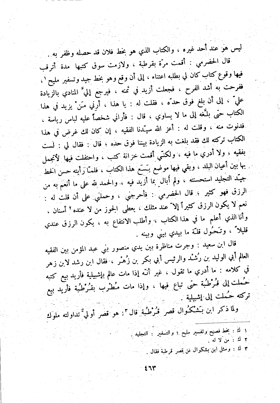 قال الحضرمي: أقمت مرّة بقرطبة، ولازمت سوق كتبها مدة أترقب فيها وقوع كتاب كان لي بطلبه اعتناء، إلى أن وقع وهو بخط جيد وتسفير مليح (1) ، ففرحت به أشد الفرح، فجعلت أزيد في ثمنه، فيرجع إليّ المنادي بالزيادة عليّ، إلى أن بلغ فوق حدّه، فقلت له: يا هذا أرني من يزيد في هذا الكتاب حتى بلّغه إلى ما لا يساوي، قال: فأراني شخصاً عليه لباس رياسة، فدنوت منه، وقلت له: أعز الله سيّدنا الفقيه، إن كان لك غرض في هذا الكتاب تركته لك فقد بلغت به الزيادة بيننا فوق حده؛ قال: فقال لي: لست بفقيه، ولا أدري ما فيه، ولكنّي أقمت خزانة كتب، واحتفلت فيها لأتجمل بها بين أعيان البلد، وبقي فها موضع يسع هذاالكتاب، فلمّا رأيته حسن الخط جيّد التجليد استحسنته، ولم أبال بما أزيد فيه، والحمد لله على ما أنعم به من الرزق فهو كثير؛ قال الحضرمي: فأحرجني، وحملني على أن قلت له: نعم لا يكون الرزق كثيراً إلاّ عند مثلك، يعطى الجوز من لا عنده (2) أسنان، وأنا الذي أعلم ما في هذا الكتاب، وأطلب الانتفاع به، يكون الرزق عندي قليلاً، وتحول قلّة ما بيدي بيني وبينه.