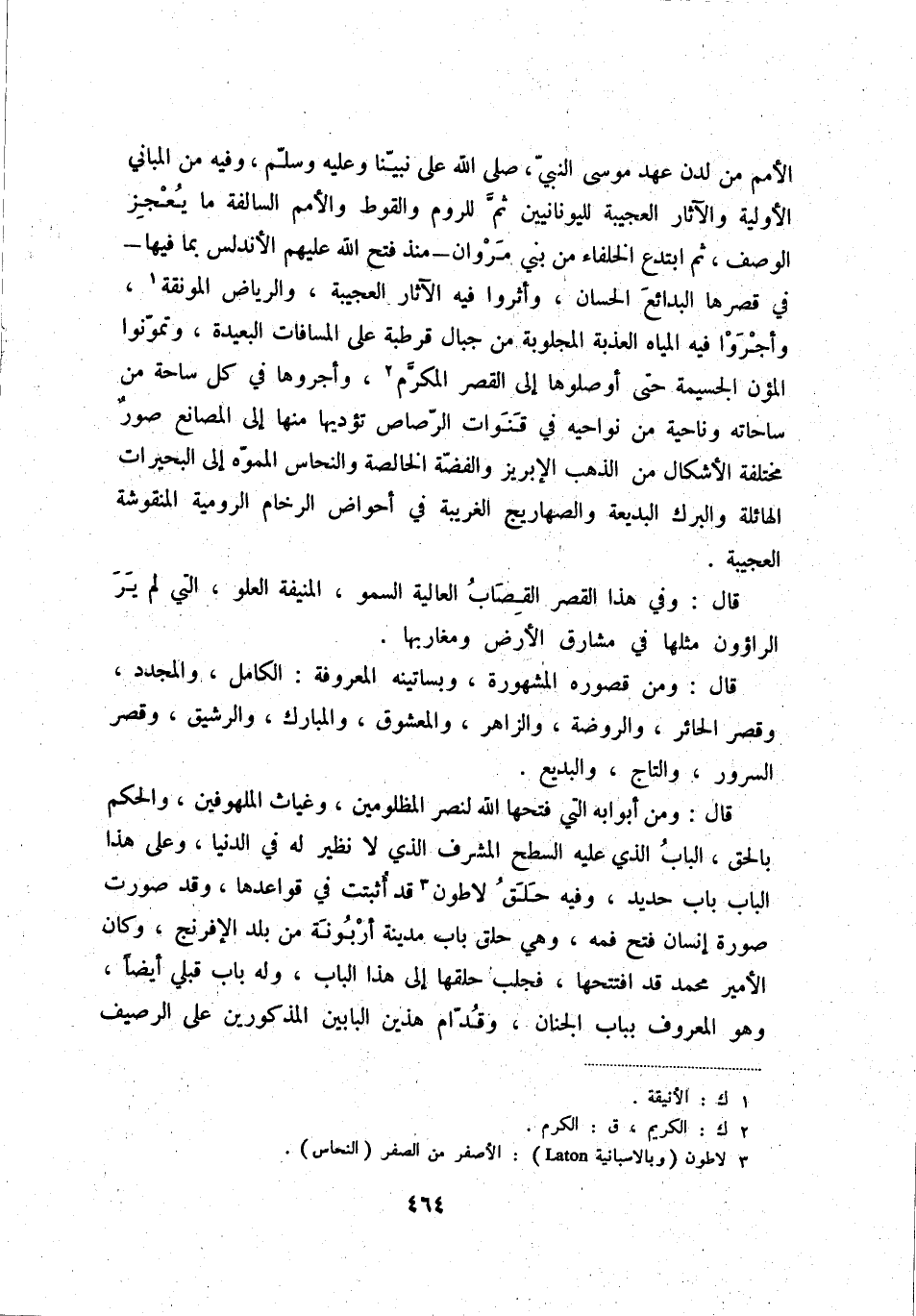 الأمم من لدن عهد موسى النبيّ، صلى الله على نبيّنا وعليه وسلّم، وفيه من المباني الأولية والآثار العجيبة لليونانيين ثمّ للروم والقوط والأمم السالفة ما يعجز الوصف، ثم ابتدع الخلفاء من بني مروان - منذ فتح الله عليهم الأندلس بما فيها - في قصرها البدائع الحسان، وأثروا فيه الآثار العجيبة، والرياض المونقة (1) ، وأجروا فيه المياه العذبة المجلوبة من جبال قرطبة على المسافات البعيدة، وتموّنوا المؤن الجسيمة حتى أوصلوها إلى القصر المكرّم (2) ، وأجروها في كل ساحة من ساحاته وناحية من نواحيه في قنوات الرّصاص تؤديها منها إلى المصانع صورٌ مختلفة الأشكال من الذهب الإبريز والفضّة الخالصة والنحاس المموّه إلى البحيرات الهائلة والبرك البديعة والصهاريج الغريبة في أحواض الرخام الرومية المنقوشة العجيبة.