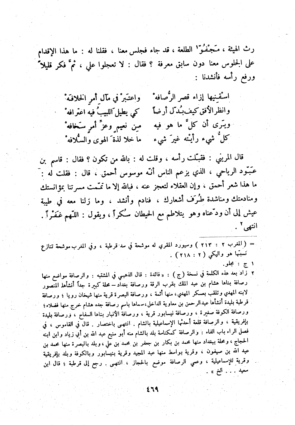 (2) زاد بعد هذه الكلمة ف نسخة (ج) : " فائدة: قال الذهبي في المشتبه: والرصافة مواضع منها رصافة بناها هشام بن عبد الملك بقرب الرقة ورصافة بغداد - محلة كبيرة جداً أنشأ المنصور لابنه المهدي وتلقب بعسكر المهدي، منها أئمة، ورصافة البصرة قرية منها شيخان رويا؛ ورصافة قرطبة بليدة أنشأها عبد الرحمن بن معاوية الداخل، سماها باسم رصافة جده هشام خرج منها فضلاء؛ ورصافة الكوفة صغيرة، ورصافة نيسابور قرية، ورصافة الأنبار بناها السفاح، ورصافة بليدة بإفريقية، والرصافة قلعة أحدثها الإسماعيلية بالشام. انتهى باختصار. قال في القاموس، في فصل الراء باب الفاء: والرصافة كمكناسة بلد بالشام منه أبو منيع عبد الله بن أبي زياد وابن ابنه الحجاج، ومحلة ببغداد منها محمد بن بكار بن جعفر بن محمد بن علي، وبلد بالبصرة منها محمد بن عبد الله بن صيفون، وقرية بواسط منها عبد المجيد وقرية بنيسابور وبالكوفة وبلد بإفريقية وقرية للإسماعيلية، وعمي الرصافة موضع بالحجاز، انتهى. رجع إلى قرطبة؛ قال بن سعيد ... الخ ".