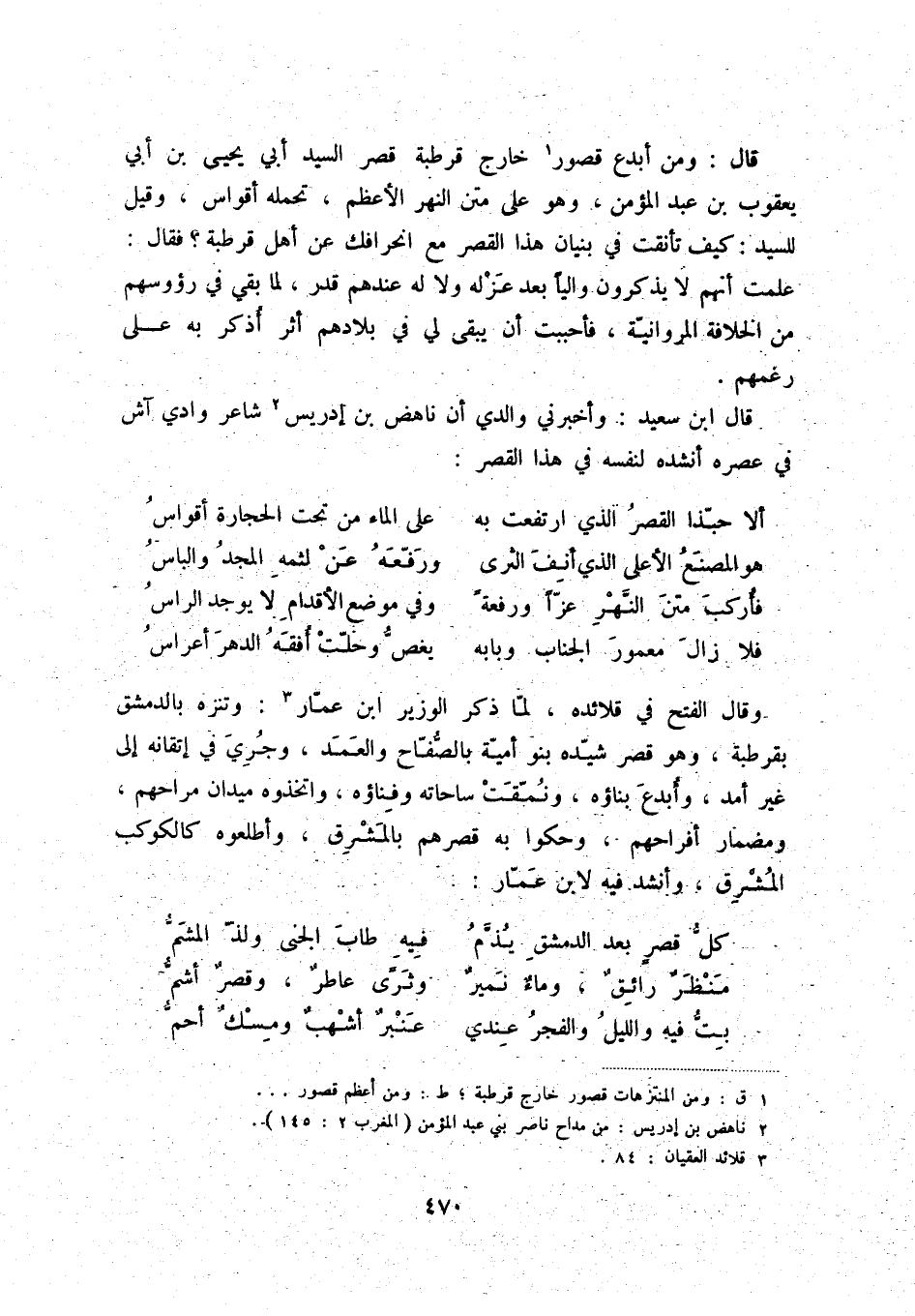 فلا زال معمور الجناب وبابه ... يغص وحلت افقه الدهر أعراس وقال الفتح في قلائده، لمّا ذكر الوزير ابن عمّار (3) : وتنزه بالدمشق بقرطبة، وهو قصر شيّده بنو أميّة بالصّفّاح والعمد، وجري في إتقانه إلى غير أمد، وأبدع بناؤه، ونمّقت ساحاته وفناؤه، واتخذوه ميدان مراحهم، ومضمار أفراحهم، وحكوا به قصرهم بالمشرق، وأطلعوه كالكوكب المشرق، وأنشد في لابن عمّار: