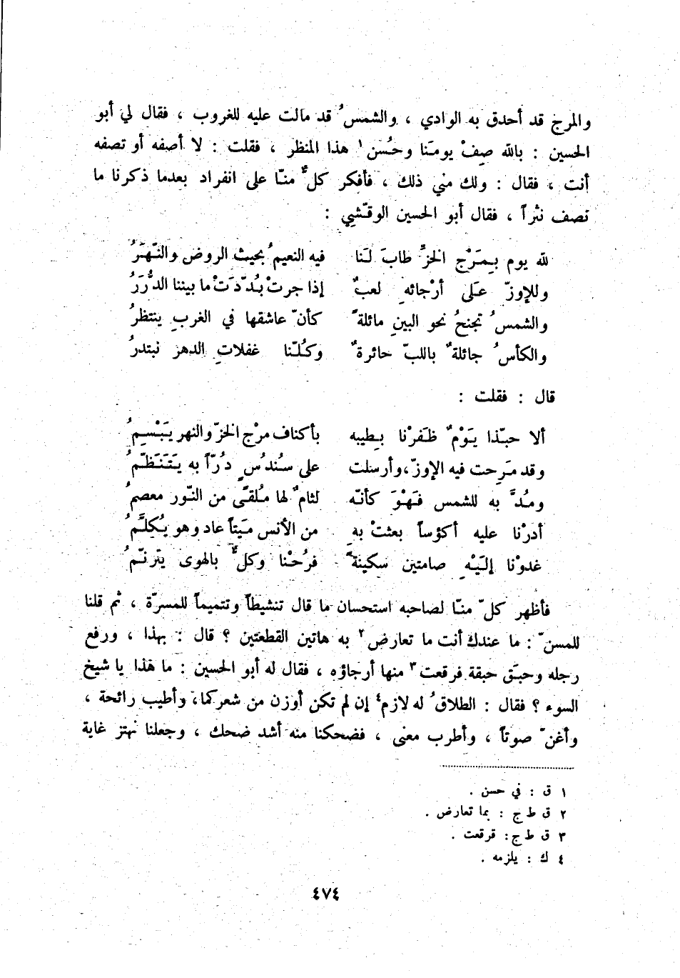غدونا إليه صامتين سكينةً ... فرحنا وكلٌّ بالهوى يترنّم فأظهر كلّ منّا لصاحبه استحسان ما قال تنشيطاً وتتميماً للمسرّة، ثم قلنا للمسنّ: ما عندك أنت ما تعارض (2) به هاتين القطعتين؟ قال: بهذا، ورفع رجله وحبق حبقة فرقعت (3) منها أرجاؤه، فقال له أبو الحسين: ما هذا يا شيخ السوء؟ فقال: الطلاق له لازم (4) إن لم تكن أوزن من شعركما، وأطيب رائحة، وأغنّ صوتاً، وأطرب معنى، فضحكنا منه اشد ضحك، وجعلنا نهتز غاية