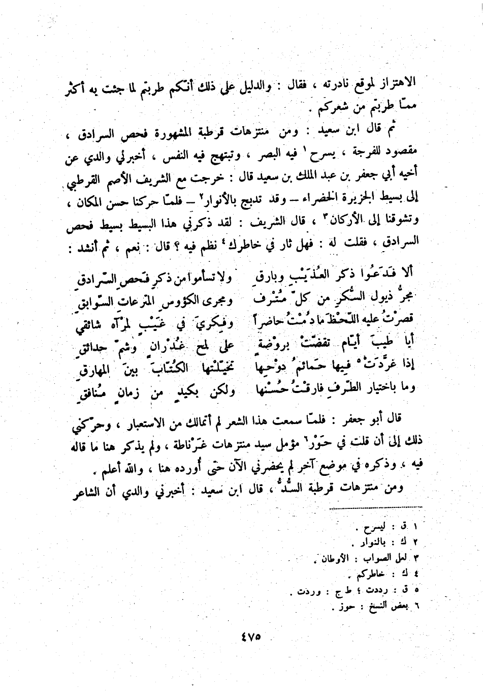 ثم قال ابن سعيد: ومن منتزهات قرطبة المشهورة فحص السرادق، مقصود للفرجة، يسرح (1) فيه البصر، وتبتهج فيه النفس، وأخبرني والدي عن أخيه أبي جعفر بن عبد الملك بن سعيد قال: خرجت مع الشريف الأصم القرطبي إلى بسيط الجزيرة الخضراء - وقد تدبج بالأنوار (2) - فلمّا حركنا حسن المكان، وتشوقنا إلى الأركان (3) ، قال الشريف: لقد ذكرني هذا البسيط بسيط فحص السرادق، فقلت له: فهل ثار في خاطرك (4) نظم فيه؟ قال: نعم، ثم أنشد: