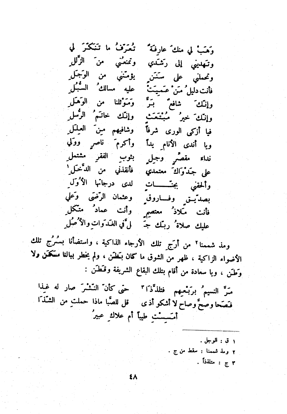 ومذ شممنا من أرج تلك الأرجاء الذاكية، واستضأنا بسرج تلك الأضواء الزاكية، ظهر من الشوق ما كان بطن، ولم يخطر ببالنا سكن ولا وطن، ويا سعادة من اقام بتلك البقاع الشريفة وقطن: