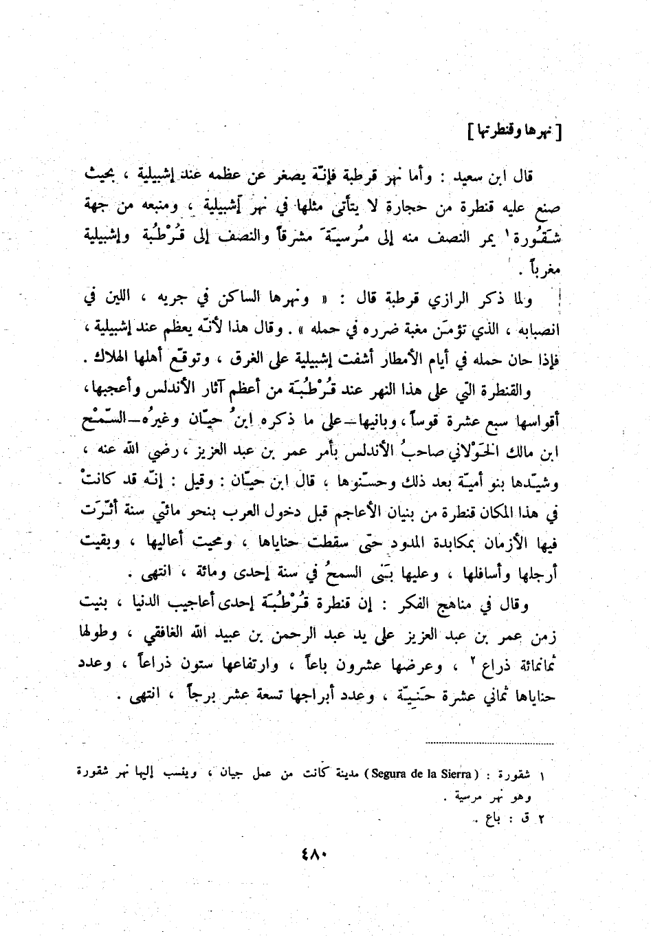 وقال في مناهج الفكر: إن قنطرة قرطبة إحدى أعاجيب الدنيا، بنيت زمن عمر بن عبد العزيز على يد عبد الرحمن بن عبيد الله الغافقي، وطولها ثمانمائة ذراع (2) ، وعرضها عشرون باعاً، وارتفاعها ستون ذراعاً، وعدد حناياها ثماني عشرة حنية، وعدد أبراجها تسعة عشر برجاً، انتهى.