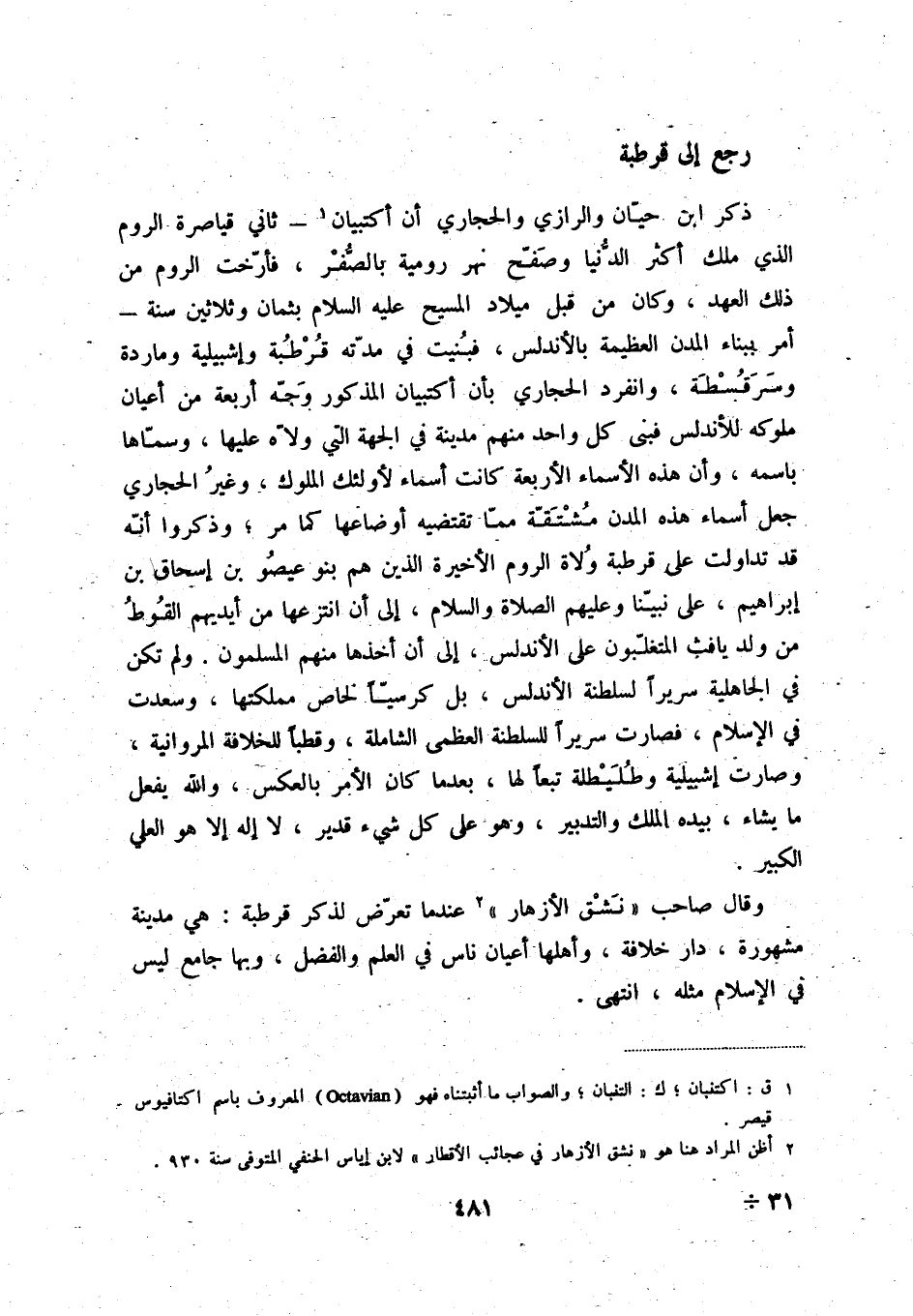 ذكر ابن حيّان والرازي والحجاري أن أكتبيان (1) - ثاني قياصرة الروم الذي ملك أكثر الدّنيا وصفّح نهر رومية بالصّفر، فأرّخت الروم، من ذلك العهد، وكان من قبل ميلاد المسيح عليه السلام بثمان وثلاثين سنة - أمر ببناء المدن العظيمة بالأندلس، فبنيت في مدّته قرطبة وإشبيلية وماردة وسرقسطة، وانفرد الحجاري بأن أكتبيان المذكور وجهّ أربعة من أعيان ملوكه للأندلس فبنى كل واحد منهم مدينة في الجهة التي ولاّه عليها، وسمّاها باسمه، وأن هذه الأسماء الأربعة كانت أسماء لأولئك الملوك، وغير الحجاري جعل أسماء هذه المدن مشتقّة ممّا تقتضيه أوضاعها كما مر؛ وذكروا أنّه قد تداولت على قرطبة ولاة الروم الأخيرة الذين هم بنو عيصو بن إسحاق بن إبراهيم، على نبيّنا وعليهم الصلاة والسلام، إلى أن انتزعها من أيديهم القوط من ولد يافث المتغلّبون على الأندلس، إلى أن أخذها منهم المسلمون. ولم تكن في الجاهلية سريراً لسلطنة الأندلس، بل كرسيّاً لخاص مملكتها، وسعدت في الإسلام، فصارت سريراً للسلطنة العظمى الشاملة، وقطباً للخلافة المروانية، وصارت إشبيلية وطليطلة تبعاً لها، بعدما كان الأمر بالعكس، والله يفعل ما يشاء، بيده الملك والتدبير، وهو على كل شيء قدي، لا إله إلا هو العلي الكبير.