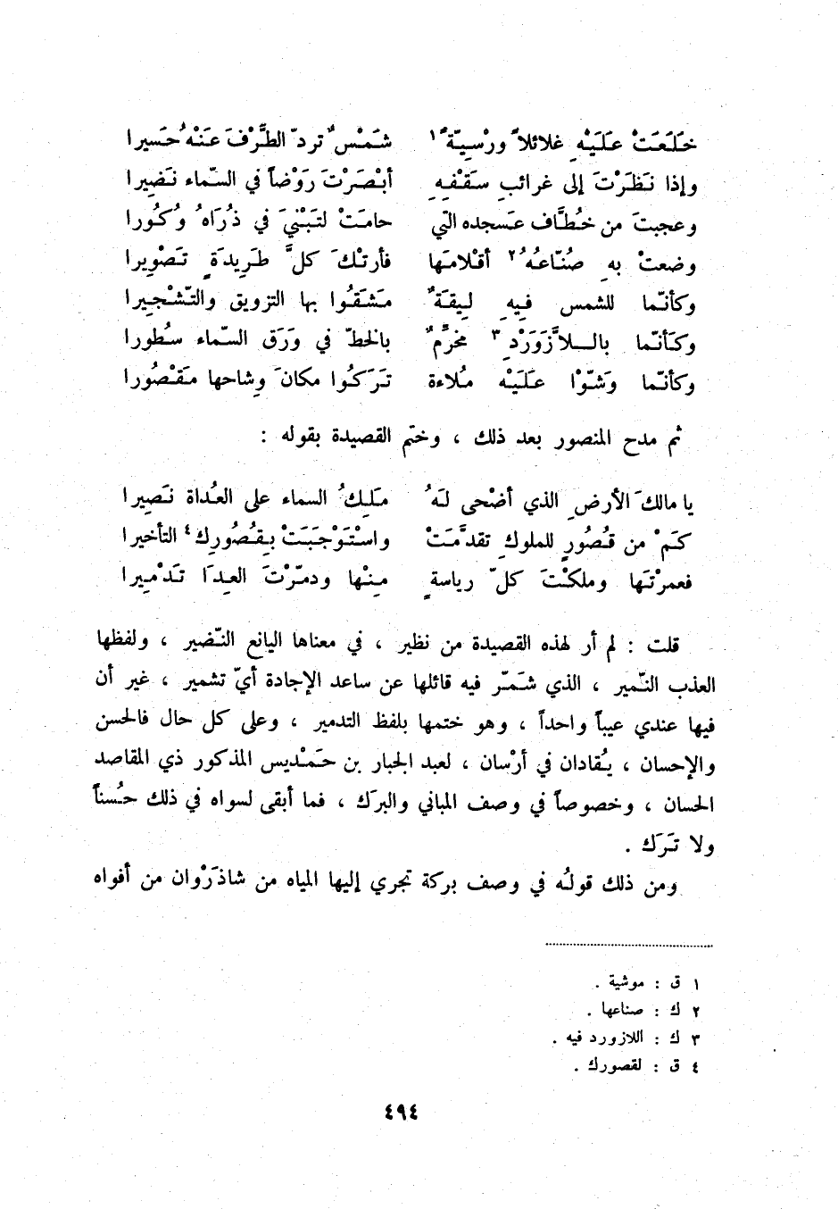 وكأنّما وشّوا عليه ملاءة ... تركوا مكان وشاحها مقصورا ثم مدح المنصور بعد ذلك، وختم القصيدة بقوله: