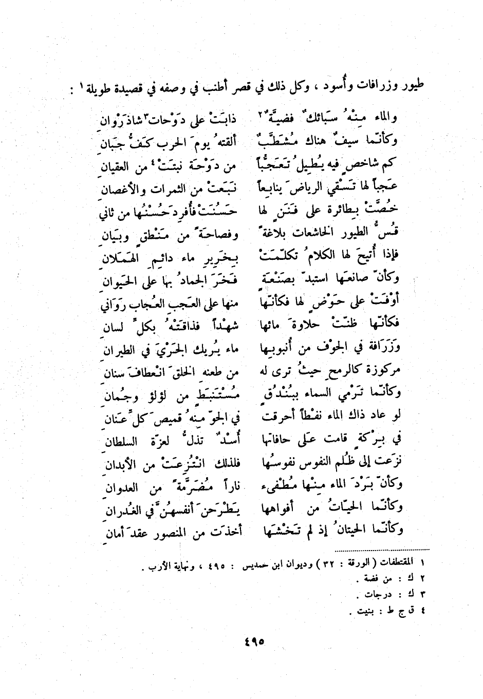 طيور وزرافات وأسود، وكل ذلك في قصر أطنب في وصفه في قصيدة طويلة (1) :