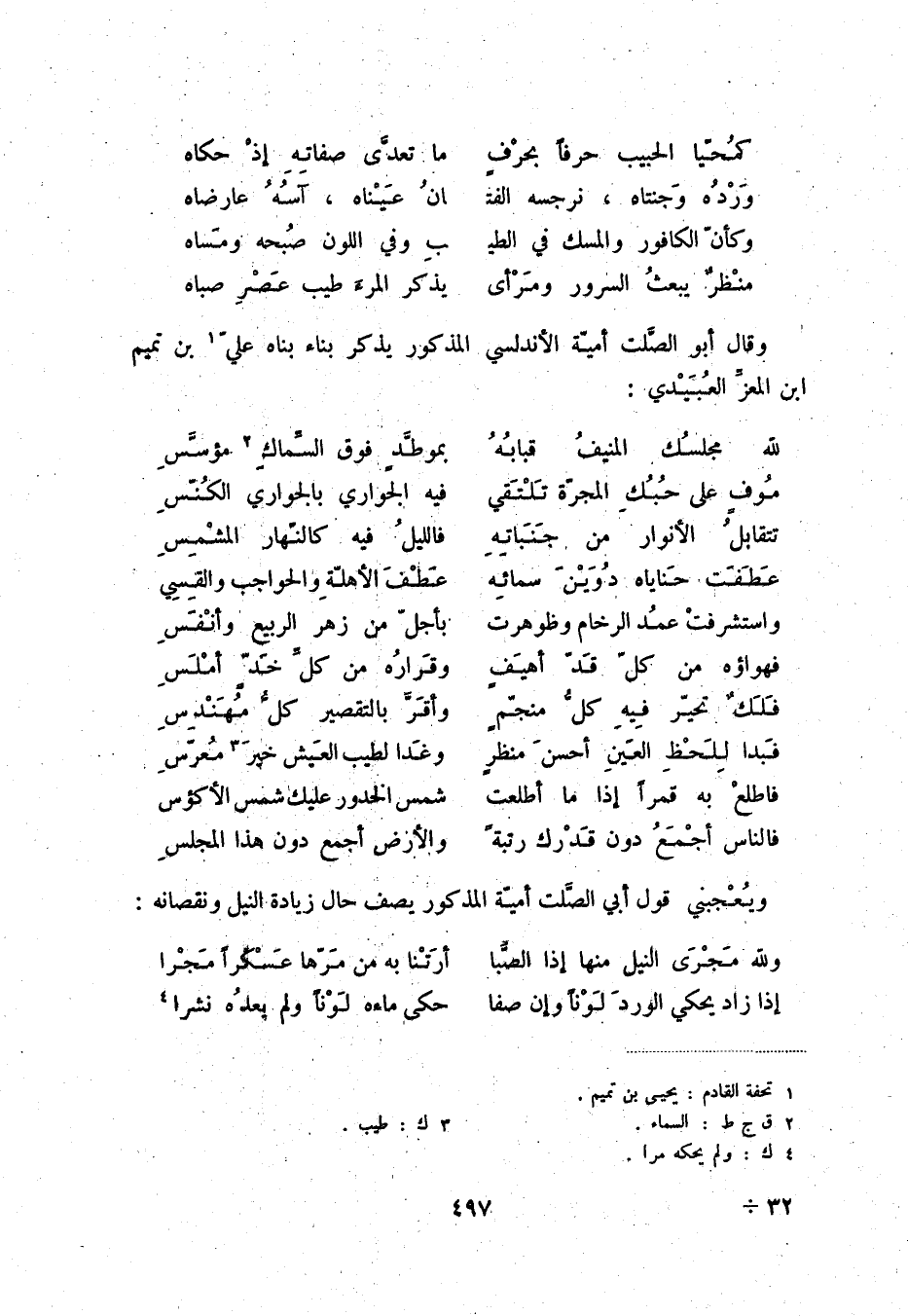 فالناس أجمع دون قدرك رتبةً ... والأرض أجمع دون هذا المجلس ويعجبني قول أبي الصّلت أميّة المذكور يصف حال زيادة النيل ونقصانه: