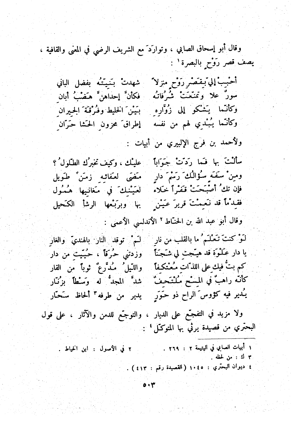 يدير فيه كؤوس الراح ذو حورٍ ... يدير من طرفه (3) ألحظ سحّار ولا مزيد في التفجّع على الديار والتوجع للدمن والآثار، على قول البحتري من قصيدة يرثي بها المتوكّل (4) :