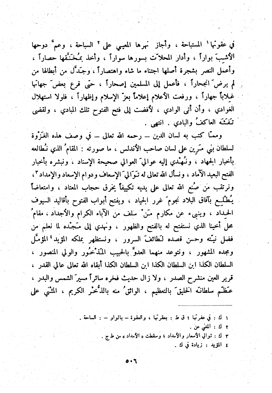 وممّا كتب به لسان الدين - رحمه الله تعالى - في وصف هذه الغزوة لسلطان بني مرين على لسان صاحب الأندلس، ما صورته: المقام الذي نطالعه بأخبار الجهاد، ونهدي إليه عوالي العوالي صحيحة الإسناد، ونبشره بأخبار الفتح البعيد الآماد، ونسأل الله تعالى له توالي الإسعاف ودوام الإسعاد والإمداد (3) ، ونرتقب من صنع الله تعالى على يديه تكييفاً يخرق حجاب المعتاد، وامتعاضاً يطلع بآفاق البلاد نجوم غرر الجياد، ويفتح أبوا بالفتوح بأقاليد السيوف الحداد، وينبئ عن مكارم من سلف من الآباء الكرام والأجداد، مقام محل أخينا الذي نستفتح له بالفتح والظهور، ونهدي إلى مجده لما نعلم من فضل نيّته وحسن قصده لطائف السرور، ونستظهر بملكه المؤيد (4) المؤمّل ومجده المشهور، ونتوعد منهما العدوّ بالحبيب المذخور والولي المنصور، السلطان الكذا ابن السلطان الكذا ابن السلطان الكذا أبقاه الله تعالى عالي القدر، قرير العين منشرح الصدر، ولا زال حديث فخره سائراً مسير الشمس والبدر، عظّم سلطانه الخليق بالتعظيم، الواثق منه بالذّخر الكريم، المثني على