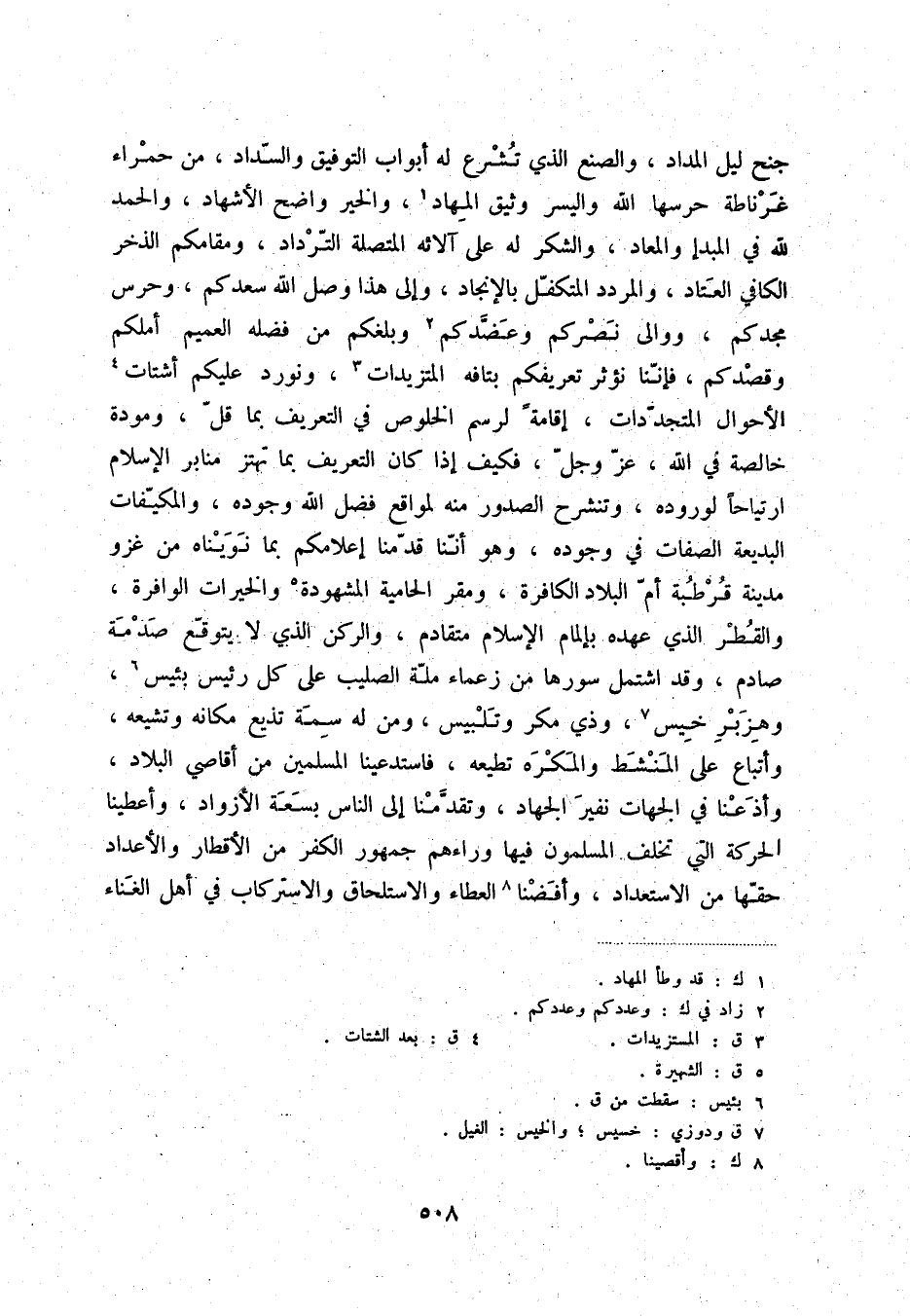 جنح ليل المداد، والصنع الذي شرع له أبواب التوفيق والسّداد، من حمراء غرناطة حرسها الله واليسر وثيق المهاد (1) ، والخير واضح الأشهاد، والحمد لله في المبدإ والمعاد، والشكر له على آلائه المتصلة التّرداد، ومقامكم الذخر الكافي العتاد، والمردد المتكفّل بالإنجاد، وإلى هذا وصل الله سعدكم، وحرس مجدكم، ووالى نصركم وعضّدكم (2) وبلغكم من فضله العمين أملكم وقصدكم، فإنّنا نؤثر تعريفكم بتافه المتزايدات (3) ، ونورد عليكم أشتات (4) الأحوال المتجدّدات، إقامةً لرسم الخلوص في التعريف بما قلّ، ومودة خالصة في الله، عزّ وجلّ، فكيف إذا كان التعريف بما تهتز منابر الإسلام ارتياحاً لوروده، وتنشرح الصدور منه لمواقع فضل الله وجوده، والمكيّفات البديعة الصفات في وجوده، وهو أنّنا قدّمنا إعلامكم بما نويناه من غزو مدينة قرطبة أمّ البلاد الكافرة، ومقر الحمية المشهودة (5) والخيرات الوافرة، والقطر الذي عهده بإلمام الإسلام متقادم، والركن الذي لا يتوقّع صدمة صادم، وقد اشتمل سورها من زعماء ملّة الصليب على كل رئيس بئيس (6) ، وهزبر ootnote>7، وذي مكر وتلبيس، ومن له سمة تذيع مكانه وتشيعه، وأباع على المنشط والمكره تطيعه، فاستدعينا المسلمين من أقاصي البلاد، وأذعنا في الجهات نفير الجهاد، وتقدّمنا إلى الناس بسعة الأزواد، وأعطينا الحركة التي تخلف المسلمون فيها وراءهم جمهور الكفر من الأقطار والأعداد حقّها من الاستعداد، وأفضنا (8) العطاء والاستلحاق والاستركاب في أهل الغناء