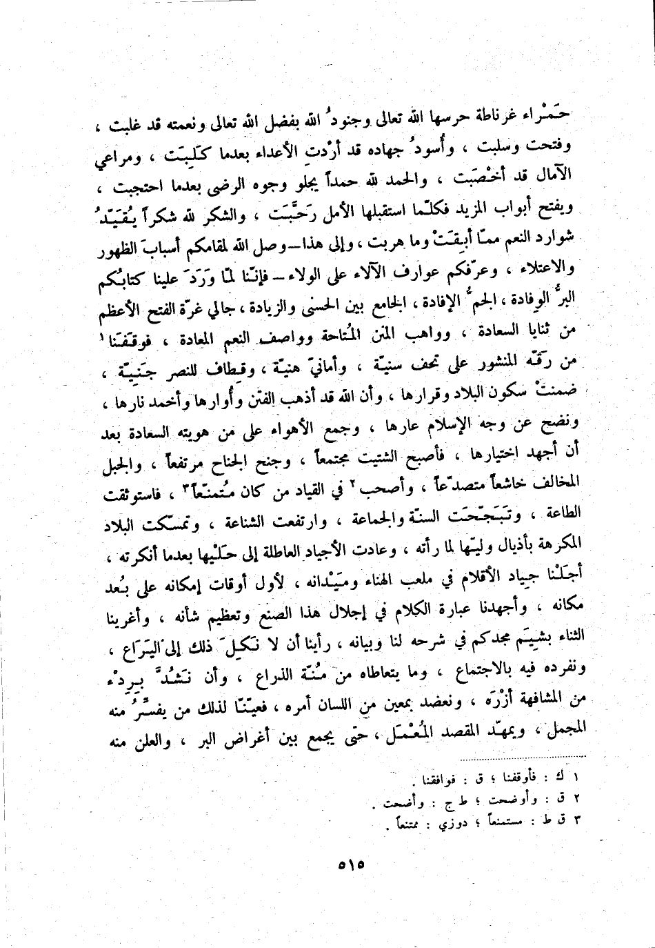 حمراء غرناطة حرسها الله تعالى وجنود الله بفضل الله تعالى ونعمته قد غلبت، وفتحت وسلبت، وأسود جهاده قد أردت الأعداء بعدما كلبت، ومراعي الآمال قد أخصبت، والحمد لله حمداً يجلو وجوه الرضى بعدما احتجبت، ويفتح أبواب المزيد فكلّما استقبلها الأمل رحّبت، والشكر لله شكراً يقيّد شوارد النعم ممّا أبقت وما هربت، وإلى هذا - وصل الله لمقامكم أسباب الظهور والاعتلاء، وعرّفكم عوارف الآلاء على الولاء - فإنّنا لمّا ورد علينا كتابكم البرّ الوفادة، الجمّ الإفادة، الجامع بين الحسنى والزيادة، جالي غرّة الفتح الأعظم من ثنايا السعادة، وواهب المنن المتاحة وواصفالنعم العادة، فوقفنا (1) من رقّه المنشور على تحف سنيّة، وأمانيّ هنيّة، وقطاف للنصر جنيّة، ضمنت سكون البلاد وقرارها، وأن الله قد أذهب الفتن وأوارها وأخمد نارها، ونضح عن وجه الإسلام عارها، وجمع الأهواء على من هويته السعادة بعد أن أجهد اختيارها، فأصبح الشتيت مجتمعاً، وجنح الجناح مرتفعاً، والجبل المخالف خاشعاً متصدّعاً، وأصحب (2) في القياد من كان متمنّعاً (3) ، فاستوثقت الطاعة، وتبجّحت السنّة والجماعة، وارتفعت الشناعة، وتمسّكت البلاد المكرهة بأذيال وليّها لما رأته، وعادت الأجياد العاطلة إلى حليها بعدما أنكرته، أجلنا جياد الأقلام في ملعب الهناء وميدانه، لأول أوقات إمكانه على بعد مكانه، وأجهدنا عبارة الكلام في إجلال هذا الصنع وتعظيم شأنه، وأغرينا الثناء بشيم مجدكم في شرحه لها وبيانه، رأينا أن لا نكل ذلك إلى اليراع، ونفرده فيه بالاجتماع، وما يتعاطاه من منّة الذراع، وأن نشدّ بردء من المشافهة أزره، ونعضد بمعين من اللسان أمره، فعيّنّا لذلك من يفسّر منه المجمل، ويمهّد المقصد المعمل، حتى يجمع بين أغراض البر، والعلن منه