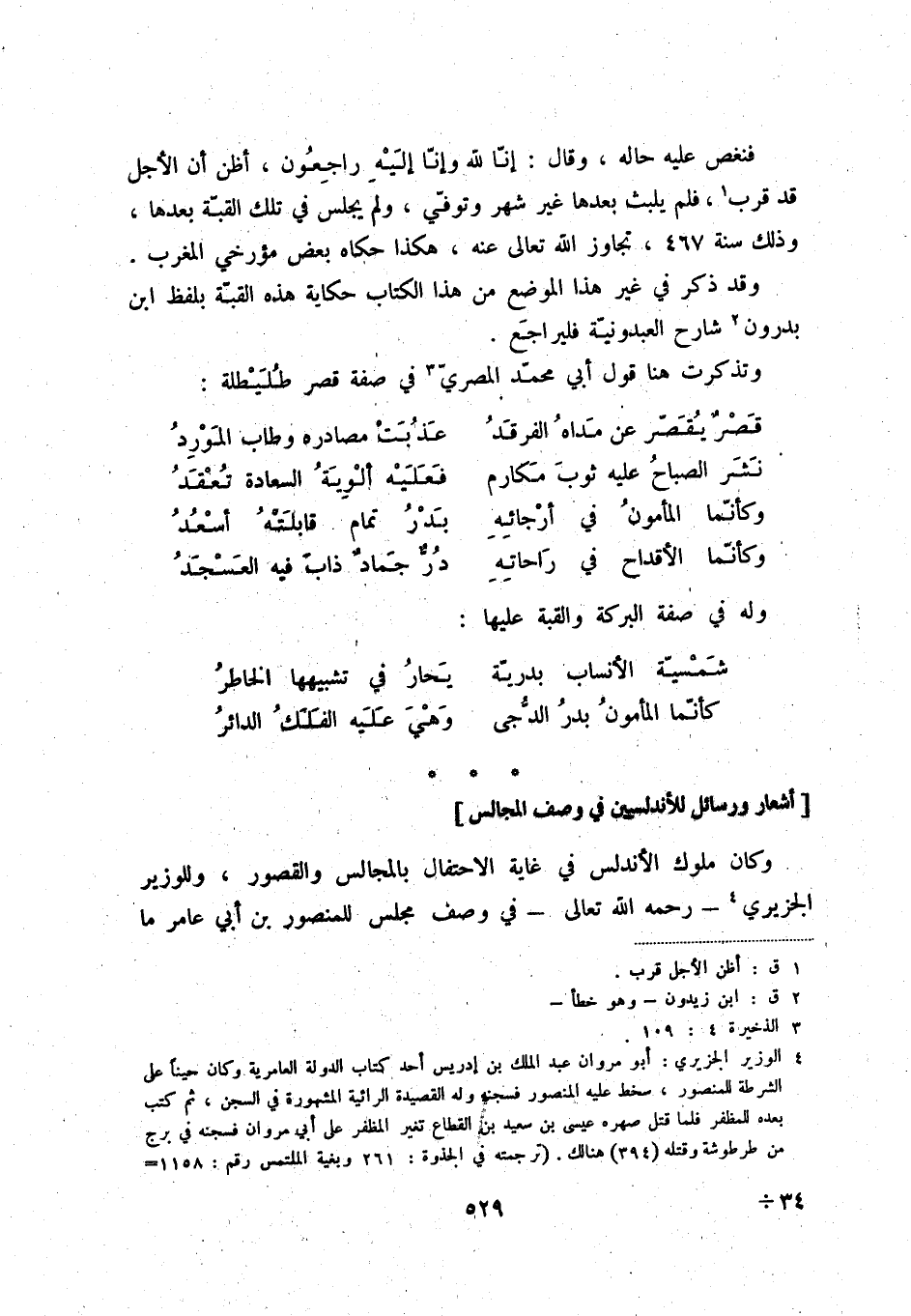 (4) الوزير الجزيري: أبو مروان عبد الملك بن إدريس أحد كتاب الدولة العامرية وكان حيناً على الشرطة للمنصور، سخط عليه المنصور فسجنه وله القصيدة الرائية المشهورة في السجن، ثم كتب بعده للمظفر فلما قتل صهره عيسى بن سعيد بن القطاع تغير المظفر على أبي مروان فسجنه في برج من طرطوشة وقتله (394) هنالك. (ترجمة ف الجذوة: 261 وبغية الملتمس رقم: 1158 والمغرب 2: 321 واعتاب الكتاب: 193 والذخيرة 4: 31 والمطمح: 13 والصلة: 350 وله شعر في اليتيمة والتشبيهات والبديع) .