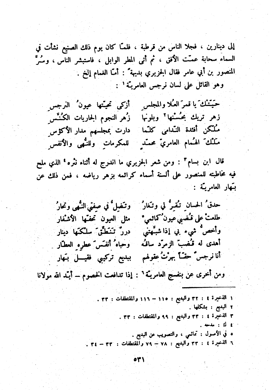 ملّكن الهمام العامريّ محمّدٍ ... للمكرمات وللنّهى والأنفس قال ابن بسام (3) : ومن شعر الجزيري ما اندرج له أثناء نثره (4) الذي ملح فيه مخاطبته للمنصور على السنة أسماء كرائمه بزهر رياضه، فمن ذلك عن بهار العامريّة: