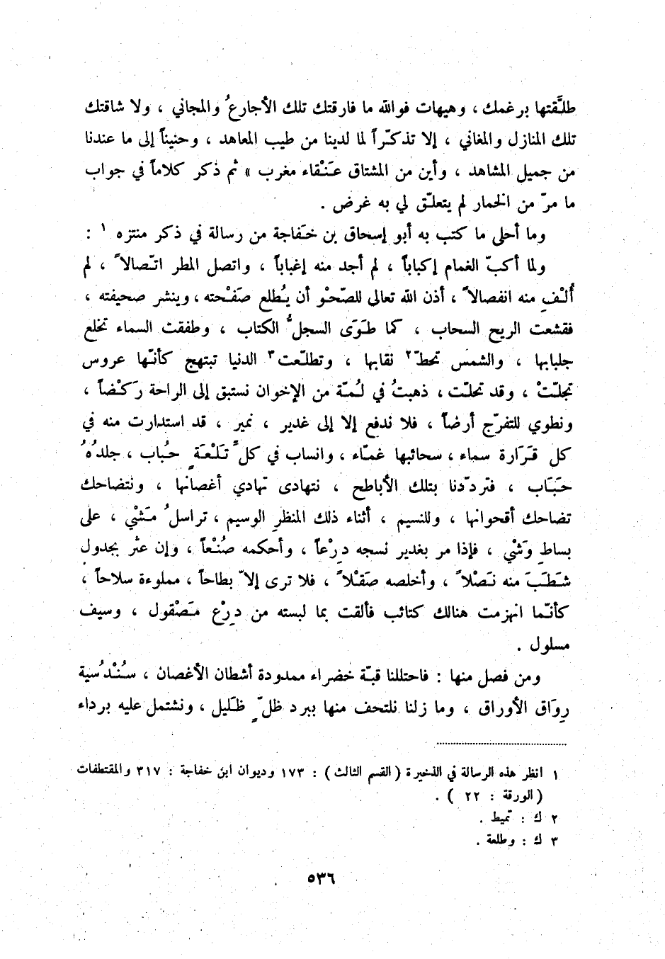 ولما أكبّ الغمام إكباباً، لم أجد منه إغباباً، واتصل المطر اتّصالاً، لم ألف منه انفصالاً، أذن الله تعالى للصّحو أن يطلع صفحته، وينشر صحيفته، فقشعت الريح السحاب، كما طوى السجلّ الكتاب، وطفقت السماء تخلع جلبابها، والشمس تحطّ (2) نقابها، وتطلّعت (3) الدنيا تبتهج كأنّها عروس تجلّت، وقد تحلّت، ذهبت في لمّة من الإخوان نستبق إلى الراحة ركضاً، ونطوي للتفرّج أرضاً، فلا ندفع إلا إلى غدير، نمير، قد استدارت منه في كل قرارة سماء، سحائبها غمّاء، وانساب في كلّ تلعةٍ حباب، وجلده حباب، فتردّدنا بتلك الأباطح، نتهادى تهادي أغصانها، ونتضاحك تضاحك أقحوانها، وللنسيم، أثناء ذلك المنظر الوسيم، تراسل مشي، على بساط وشي، فإذا مر بغدير نسجه درعاً، وأحكمه صنعاً، وإن عثر بجدول شطب منه نصلاً، وأخلصه صقلاً، فلا ترى إلاّ بطاحاً، مملوءة سلاحاً، كأنّما انهزمت هنالك كتائب فألقت بما لبسته من درع مصقول، وسيفٍ مسلول.