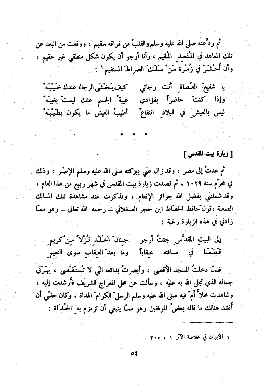 ثم عدت إلى مصر، وقد زال عني ببركته صلى الله عليه وسلم الإصر، وذلك في محرم سنة 1029، ثم قصدت زيارة بيت المقدس في شهرة ربيع من هذا العام، وقد شملتني بفضل الله جوائز الإنعام، وتذكرت عند مشاهدة تلك المسالك الصعبة، قول حافظ ابن حجر العسقلاني - رحمه الله تعالى - وهو مما زادني في هذه الزيارة رغبة: