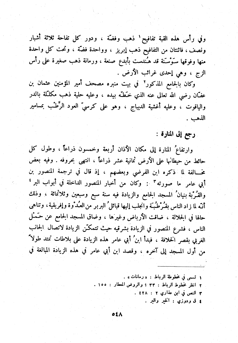 وارتفاع المنارة إلى مكان الأذان أربعة وخمسون ذراعاً، وطول كل حائط من حيطانها على الأرض ثمانية عشر ذراعاً، انتهى بحروفه. وفيه بعض مخالفة لما ذكره ابن الفرضي وبعضهم، إذ قال في ترجمة المنصور بن أبي عامر ما صورته (3) : وكان من أخبار المنصور الداخلة في أبواب البر (4) والقربة بنيان المسجد الجامع والزيادة فيه سنة سبع وسبعين وثلاثمائة، وذلك أنّه لما زاد الناس بقرطبة وانجلب إليها قبائل البربر من العدوة وإفريقية، وتناهى حالها في الجلالة، ضاقت الأرباض وغيرها، وضاق المسجد الجامع عن حمل الناس، فشرع المنصور في الزيادة بشقيه حيث تتمكّن الزيادة لاتصال الجانب الغربي بقصر الخلافة، فبدأ ابن أبي عامر هذه الزيادة على بلاطات تمتد طولاً من أول المسجد إلى آخره، وقصد ابن أبي عامر في هذه الزيادة المبالغة في