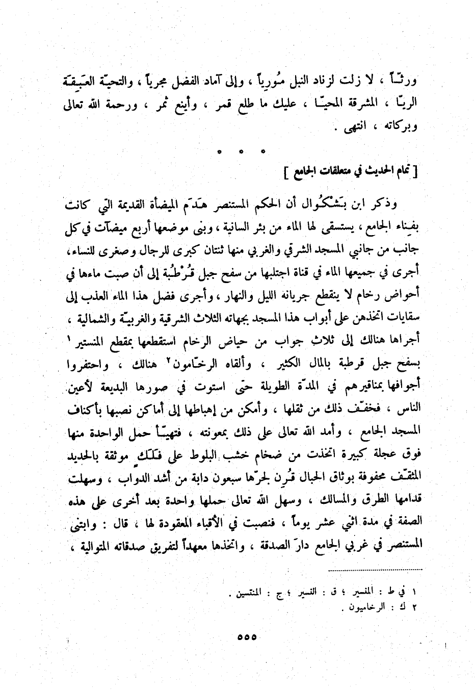 وذكر ابن بشكوال أن الحكم المستنصر هدم الميضأة القديمة التي كانت بفناء الجامع، يستسقى لها الماء من بئر السانية، وبنى موضعها أربع ميضآت في كل جانب من جانبي المسجد الشرقي والغربي منها ثنتان كبرى للرجال وصغرى للنساء، أجرى في جميعها الماء في قناة اجتلبها من سفح جبل قرطبة إلى أن صبت ماءها في أحواض رخام لا ينقطع جريانه الليل والنهار، وأجرى فضل هذا الماء العذب إلى سقايات اتخذهن على أبواب هذا المسجد بجهاته الثلاث الشرقية والغربيّة والشمالية، أجراها هنالك إلى ثلاث جواب من حياض الرخام استقطعها بمقطع المنستير (1) بسفح جبل قرطبة بالمال الكثير، وألقاه الرخّامون (2) هنالك، واحتفروا أجوافها بمناقيرهم في المدّة الطويلة حتى استوت في صورها البديعة لأعين الناس، فخفّف ذلك من ثقلها، وأمكن من إهباطها إلى أماكن نصبها بأكناف المسجد الجامع، وأمد الله تعالى على ذلك بمعونته، فتهيّأ حمل الواحدة منهافوق عجلة كبيرة اتخذت من ضخام خشب البلوط على فلكٍ موثقة بالحديد المثقّف محفوفة بوثاق الحبال قرن لجرّها سبعون دابة من أشد الدواب، وسهلت قدامها الطرق والمسالك، وسهل الله تعالى حملها واحدة بعد أخرى على هذه الصفة في مدة اثني عشر يوماً، فنصبت في الأقباء المعقودة لها، قال: وابتنى المستنصر في غربي الجامع دار الصدقة، واتخذها معهداً لتفريق صدقاته المتوالية،