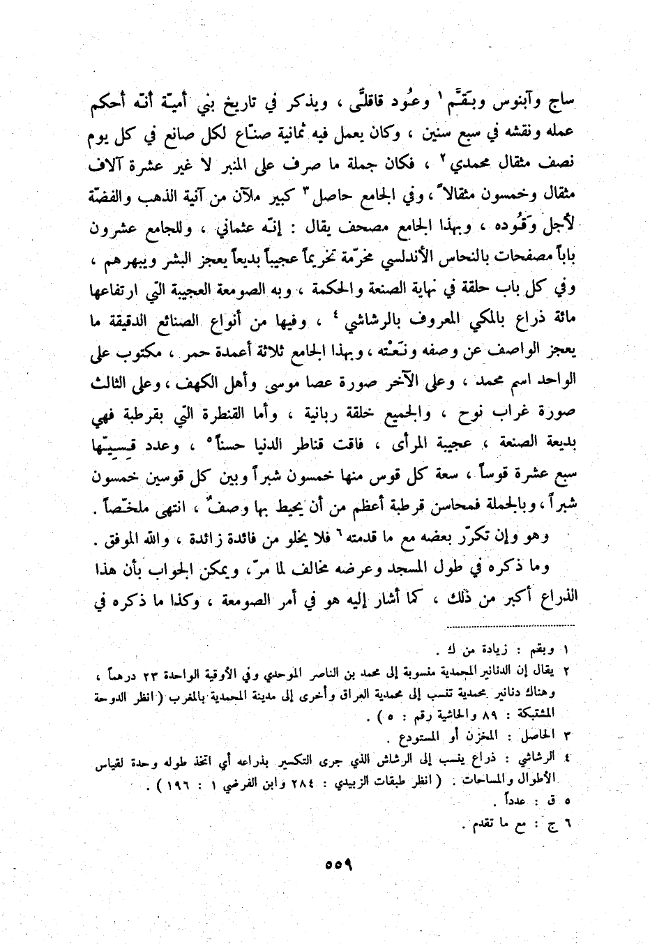 ساج وآبنوس وبقّم (1) وعود قاقلّى، ويذكر في تاريخ بني أميّة أنّه أحكم عمله ونقشه في سبع سنين، وكان يعمل فيه ثمانية صنّاع لكل صانع في كل يوم نصف مثقال محمدي (2) ، فكان جملة ما صرف على المنبر لا غير عشرة آلاف مثقال وخمسون مثقالاً، وفي الجامع حاصل (3) كبير ملآن من آنية الذهب والفضّة لجل وقوده، وبهذا الجامع مصحف يقال: إنّه عثماني، وللجامع عشرون باباً مصفحات بالنحاس الأندلسي مخرّمة تخريماً عجيباً بديعاً يعجز البشر ويبهرهم، وفي كل باب حلقة في نهاية الصنعة والحكمة، وبه الصومعة العجيبة التي ارتفاعها مائة ذراع بالمكي المعروف بالرشاشي (4) ، وفيها من أنواع الصنائع الدقيقة ما يعجز الواصف عن وصفه ونعته، وبهذا الجامع ثلاثة أعمد حمر مكتوب على الواحد اسم محمد، وعلى الآخر صورة عصا موسى وأهل الكهف، وعلى الثالث صورة غراب نوح، والجميع خلقة ربانية، وأما القنطرة التي بقرطبة فهي بديعة الصنعة، عجيبة المرأى، فاقت قناطر الدنيا حسناً (5) ، وعدد قسيّها سبع عشرة قوساً، سعة كل قوس منها خمسون شبراً وبين كل قوسين خمسون شبراً، وبالجملة فمحاسن قرطبة أعظم من أن يحيط بها وصفٌ، انتهى ملخّصاً.